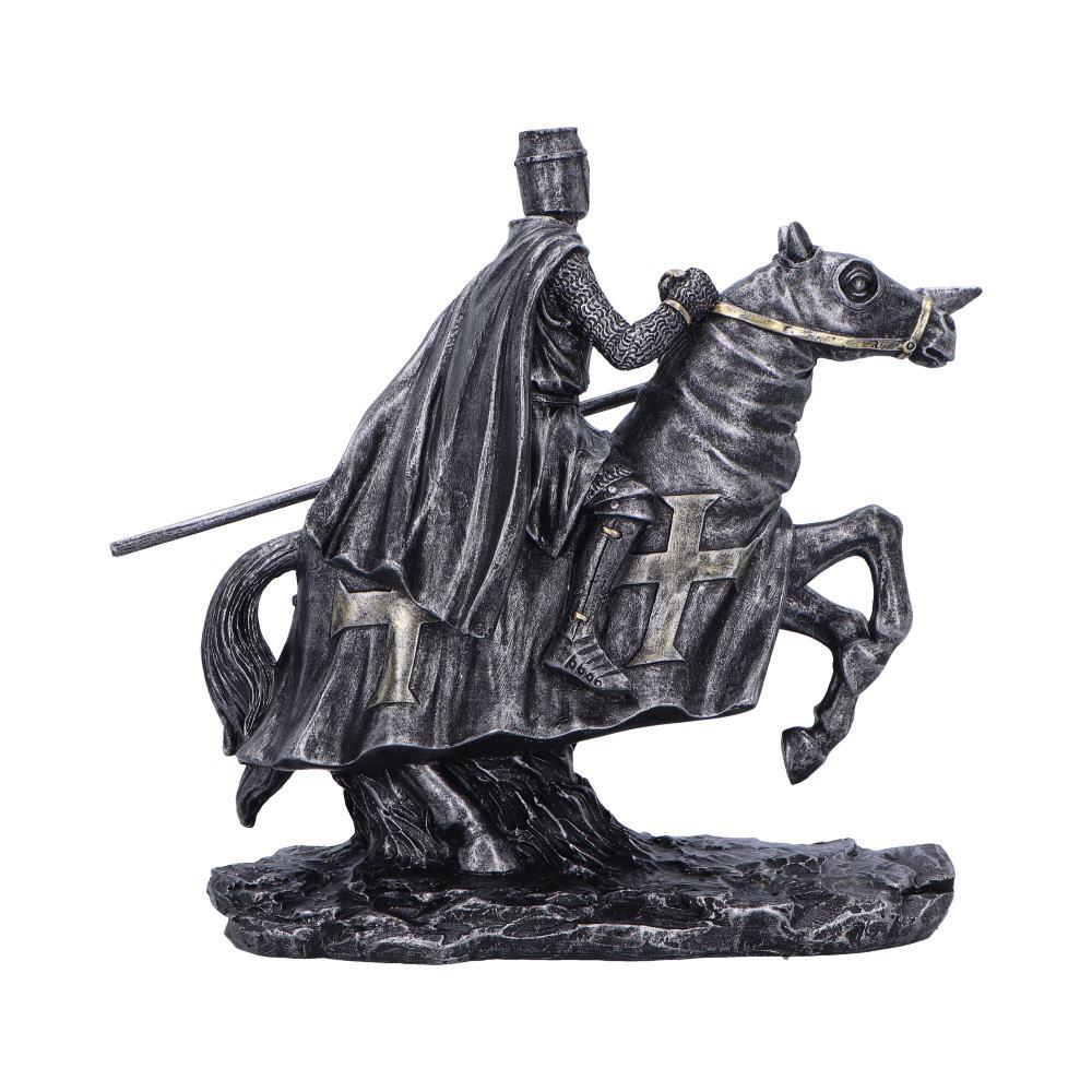 Crafted with exceptional detail and a metallic silver finish, this gothic-inspired piece showcases intricate chainmail, embossed crosses, and textured armor that evoke the glory of the Crusader era. Every contour — from the horse’s poised movement to the knight’s commanding posture — radiates strength and devotion.