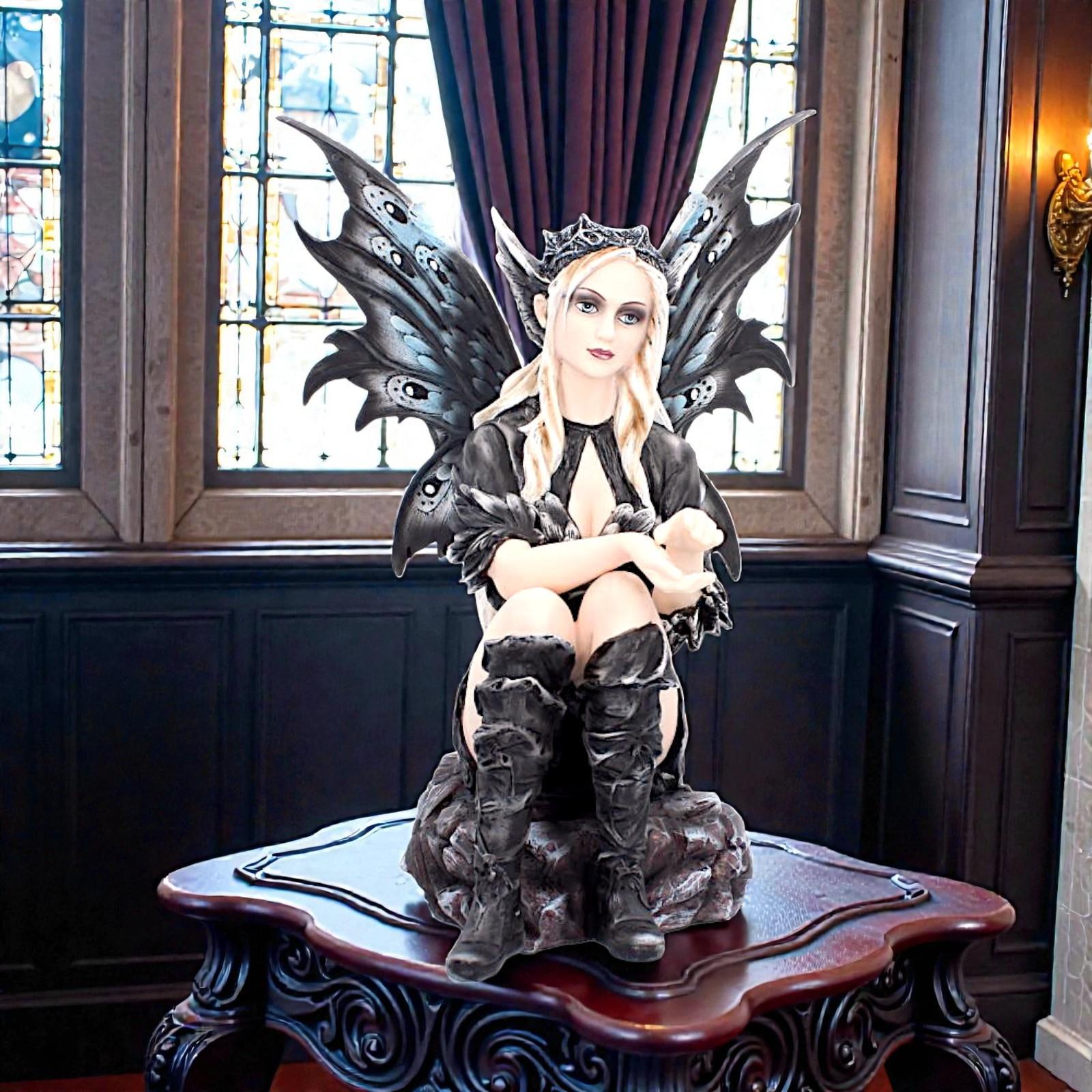 Her dramatic black wings, enriched with smoky white accents and intricate patterning, create a bold contrast against her pale features, enhancing her ethereal yet powerful presence. Cast in high-quality resin and hand-painted with precision, this figurine is a perfect centrepiece for fantasy lovers, gothic décor collectors, fairy enthusiasts, and anyone drawn to the mystical and supernatural.