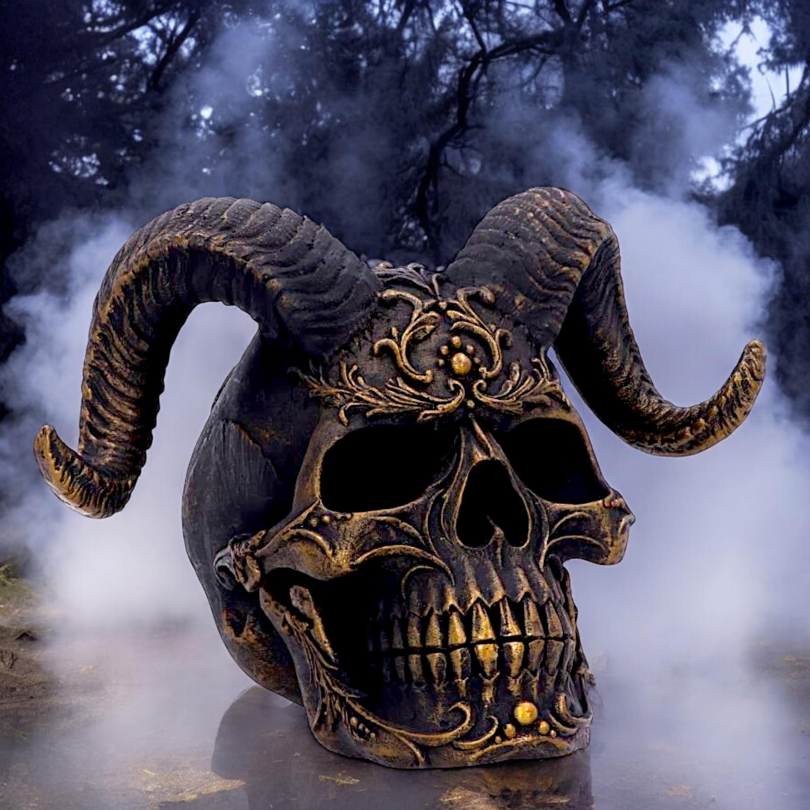 The Diabolus Horned Skull is meticulously crafted to embody the essence of gothic and demon-inspired aesthetics. With its imposing horns elegantly arching upwards, this skull figurine captures the imagination and evokes a sense of both fascination and respect for the mystique it represents. The intricate detailing highlights the unique features of each horn and the skull itself, showcasing a level of artistry that truly brings it to life.