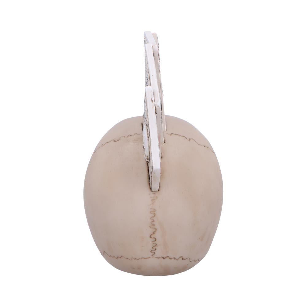 Crafted with meticulous attention to detail, this skull ornament features an impressively realistic skull that is elegantly topped with a vibrant display of playing cards. The intricate combination of bone texture and card designs creates a bold and captivating look, making it an ideal conversation starter for gatherings and a standout piece in any collection.