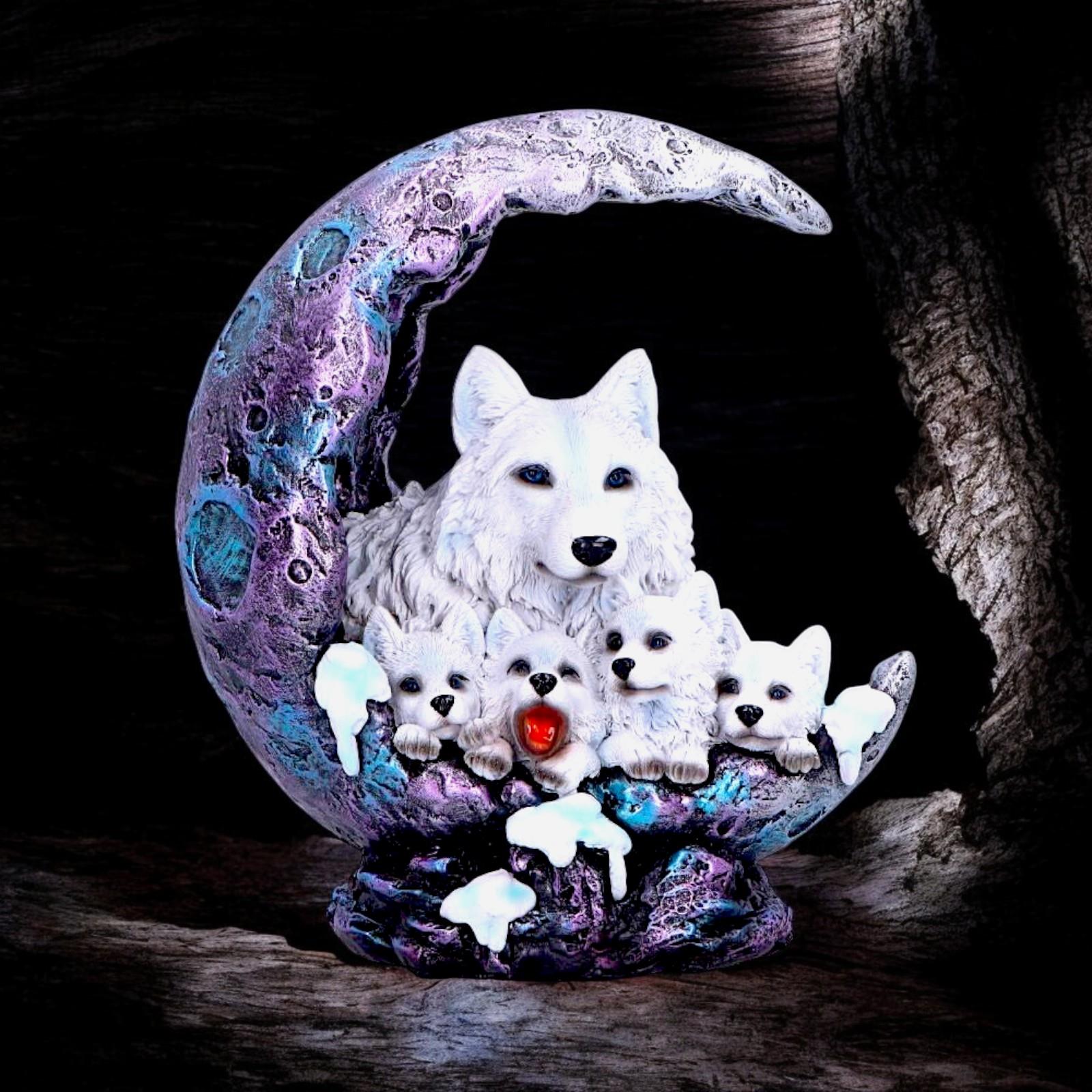 - Design: Features 4 wolf pups resting in a crescent moon with an adult wolf standing guard