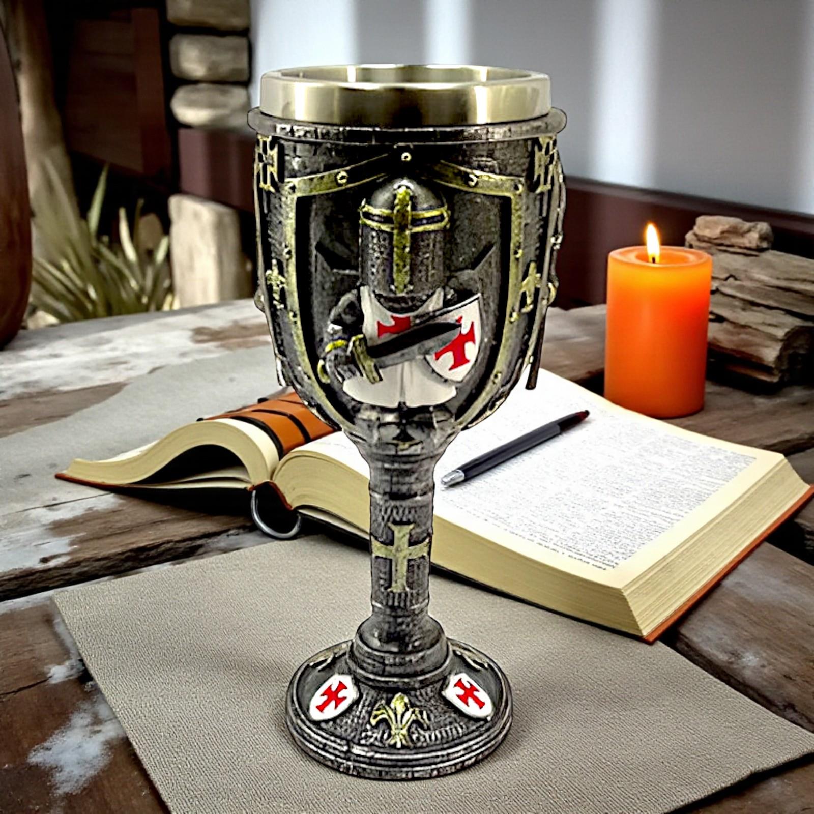 Expertly crafted from durable resin with a stainless steel insert, this goblet combines artistry with functionality. Featuring a Templar knight in full armor, complete with sword and shield adorned with the iconic red cross, it evokes the glory and symbolism of the medieval order.