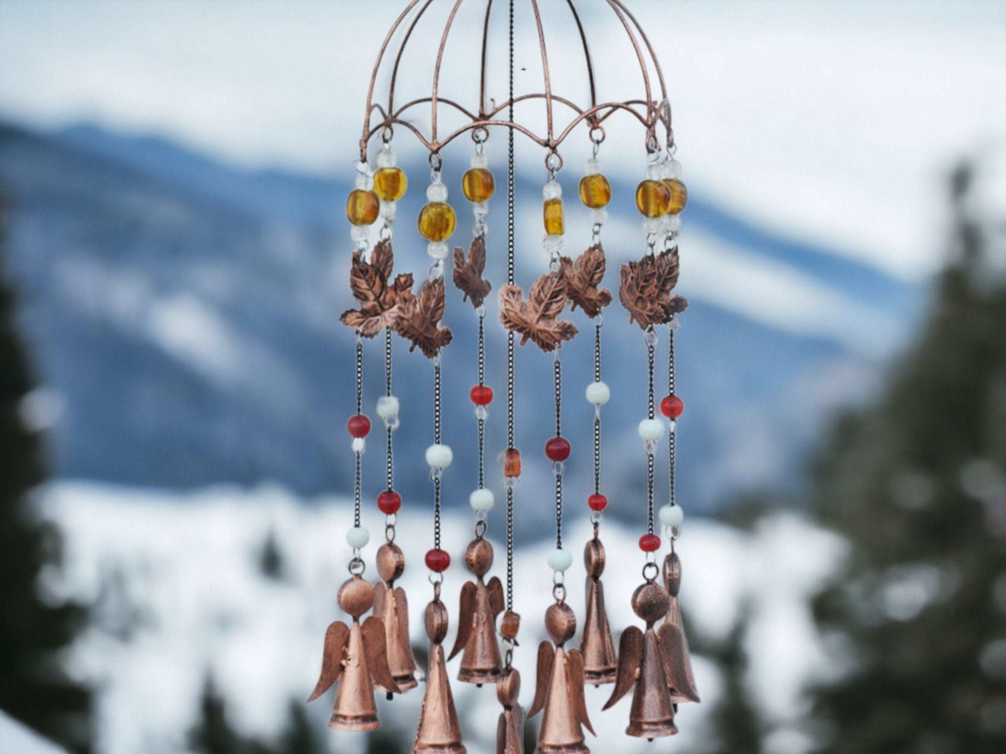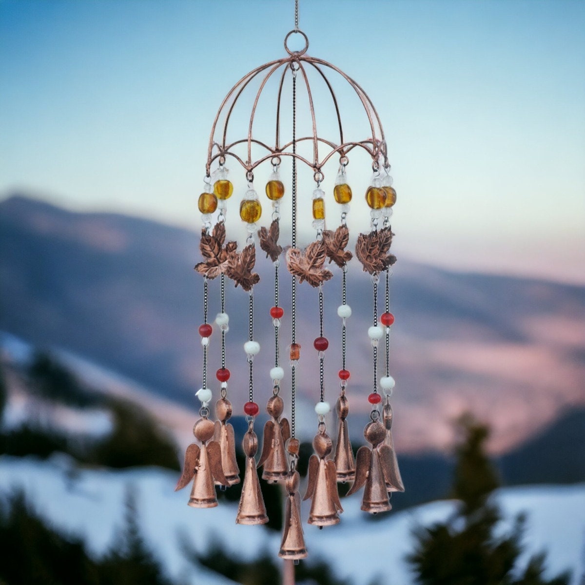 Celebrate the gentle whispers of autumn with our Handmade Large Copper Wind Chime, a stunning piece that stands at 65cm in height and 26cm in width. This artful creation blends the rustic charm of autumn leaves with the heavenly grace of copper angels, creating a wind chime that is as visually captivating as it is melodically rich.