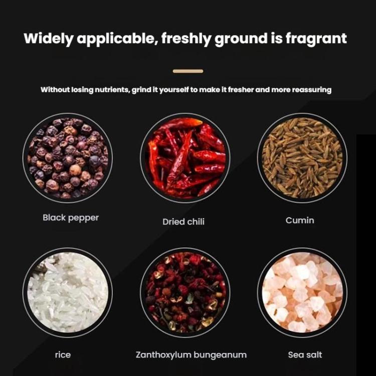 6. Widely applicable, fresh grinding without loss of nutrients, suitable for black pepper, dried chili, cumin, rice, pepper, sea salt, mung bean, white pepper, cloves, etc.