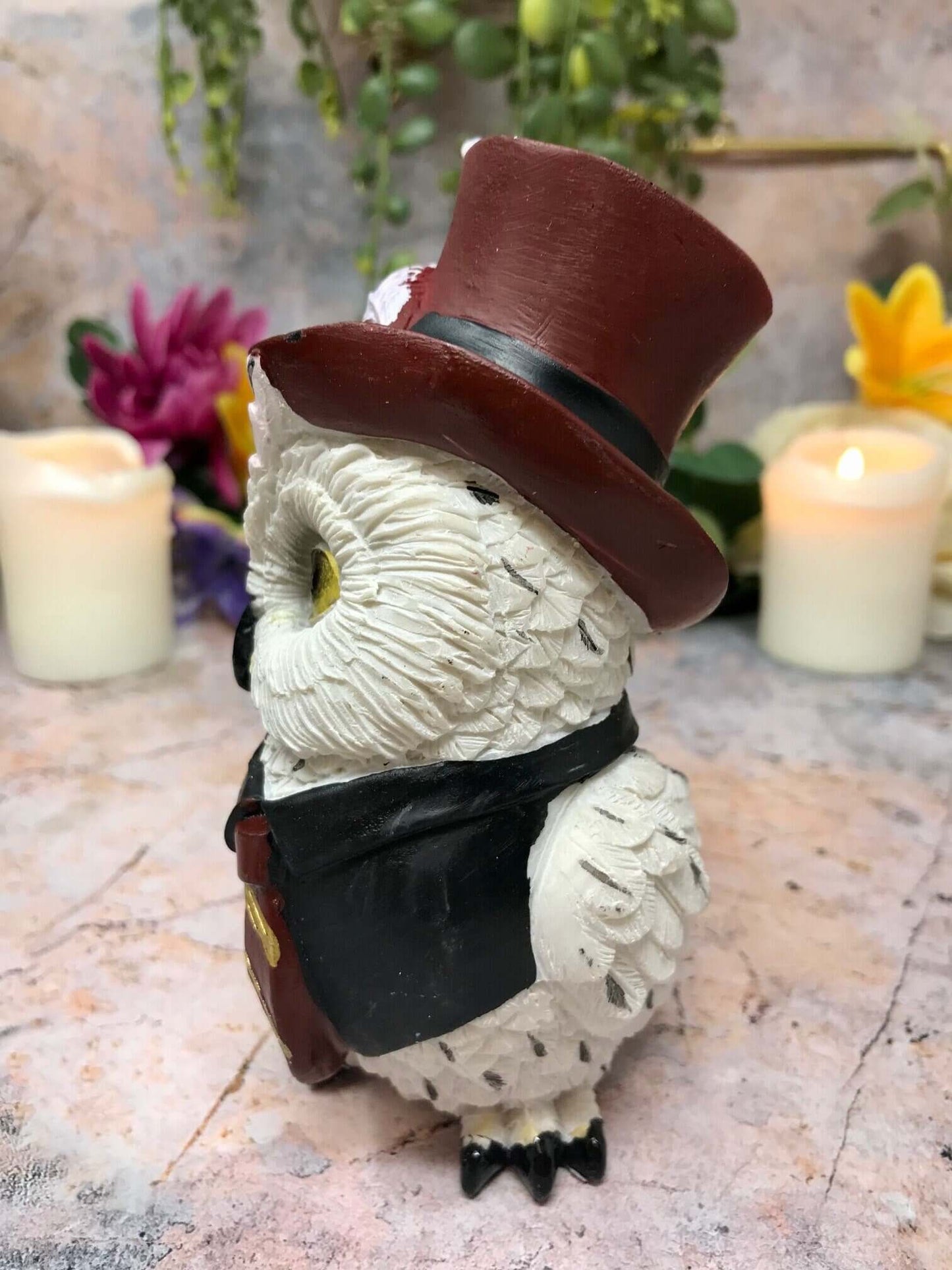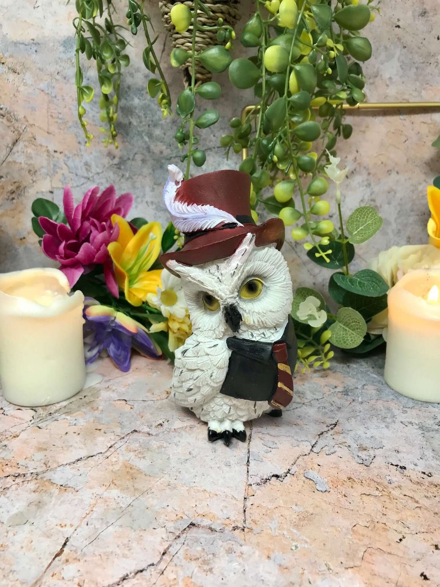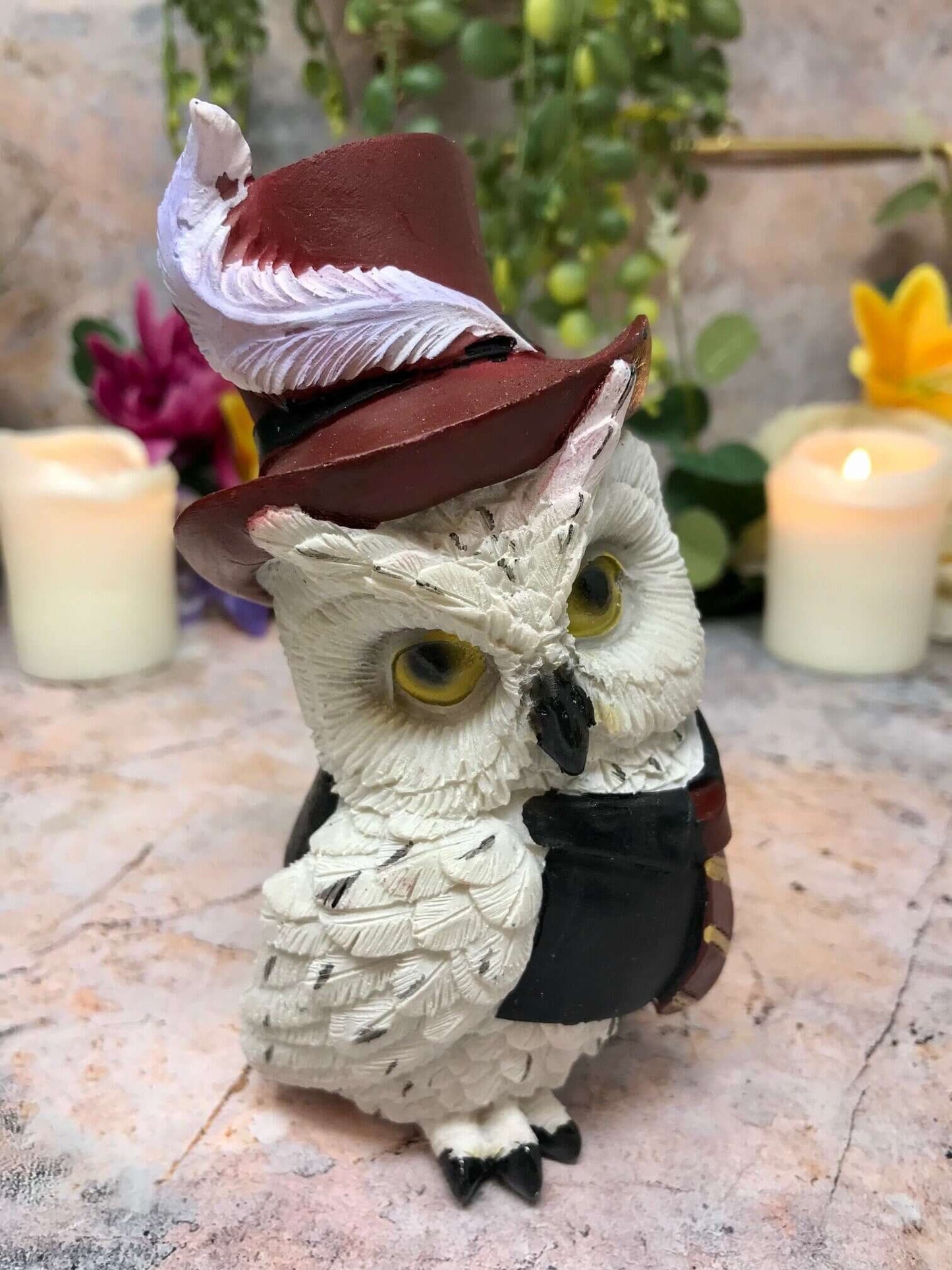 Bring a touch of steampunk to your home with this comical owl sculpture figurine! This unique piece of home decor is made from quality designer resin and features an intricate, detailed design that will make any room stand out. Perfect for owl collectors and those who appreciate a bit of fancy dress, this handmade piece of art is sure to be a conversation starter.