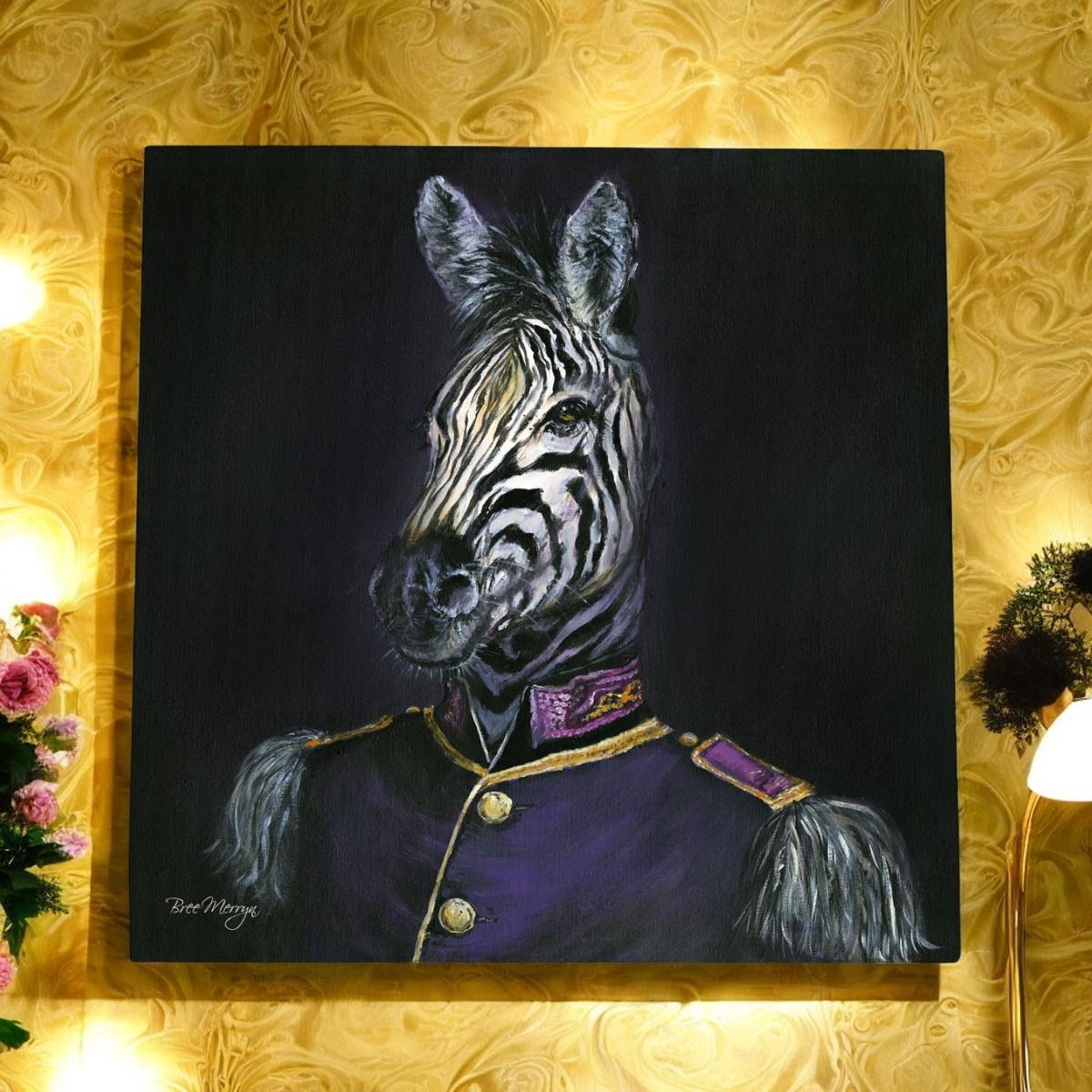 - Design: Zebra portrait in a dapper outfit, showcasing Bree Merryn's signature style