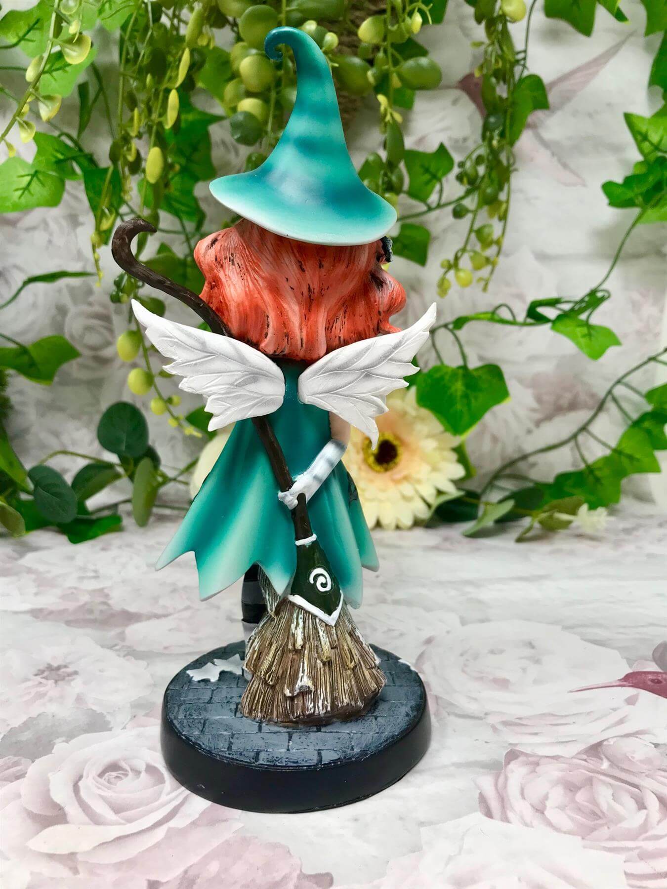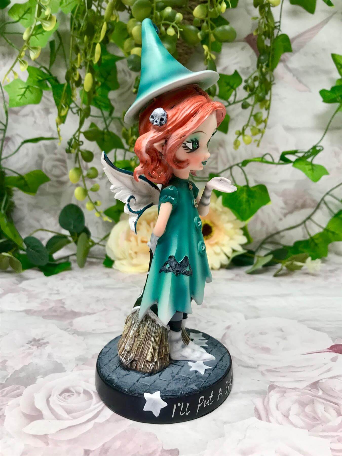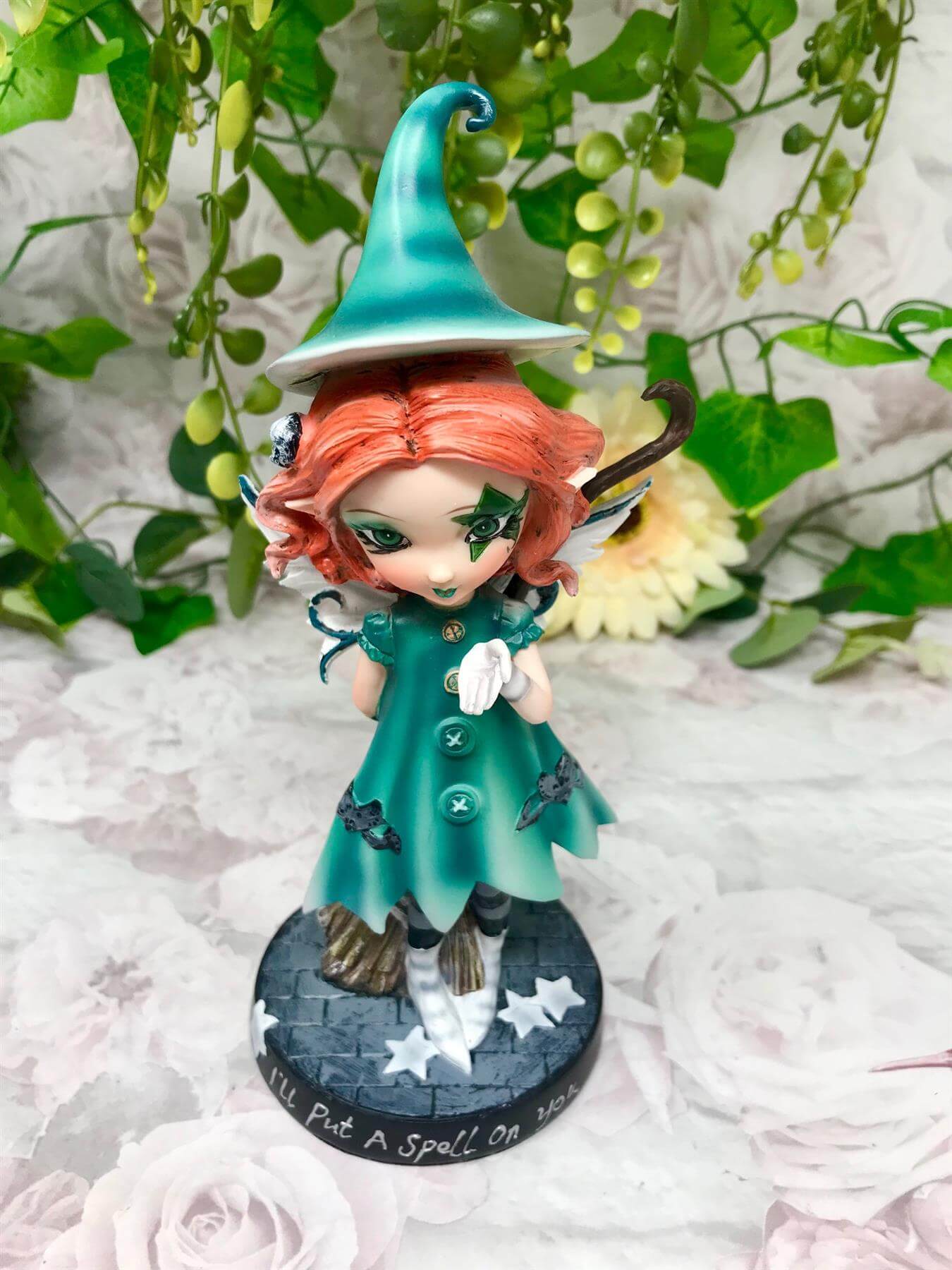 The "Spell On You" Magic Green Fairy by Selina Fenech is a stunning addition to the Dolly Fae Collection. This enchanting figurine stands approximately 4 inches tall, 3.25 inches wide, and 7.75 inches deep. Crafted from high-quality cold cast resin and meticulously handpainted, this fairy exudes exquisite detail and craftsmanship.