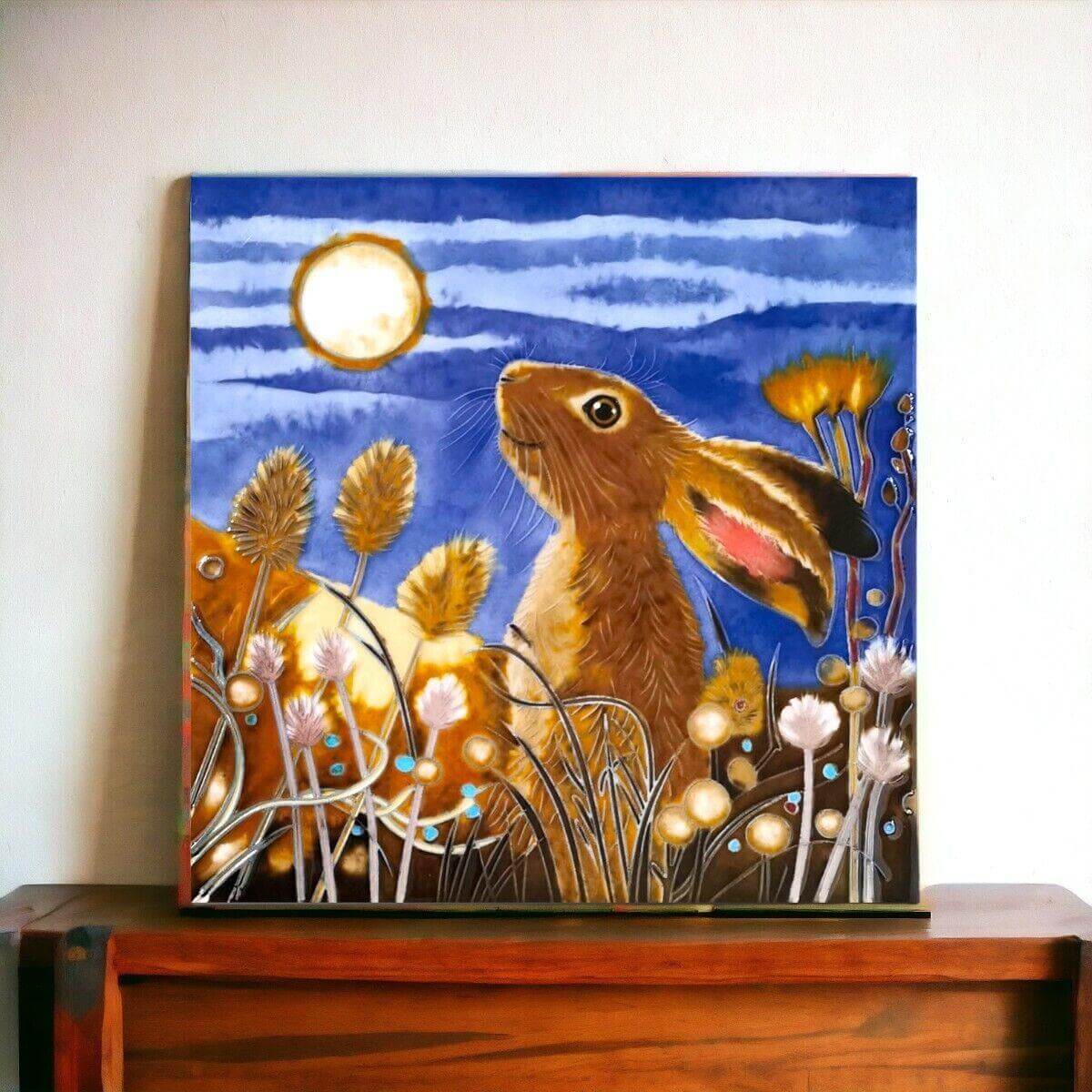 The tile showcases a hare bathed in the ethereal glow of a full moon, set against a backdrop of a dusky blue sky. The fine details of the hare's fur, the delicate textures of the surrounding flora, and the subtle interplay of light and shadow come together to form a tableau that is at once vibrant and soothing.