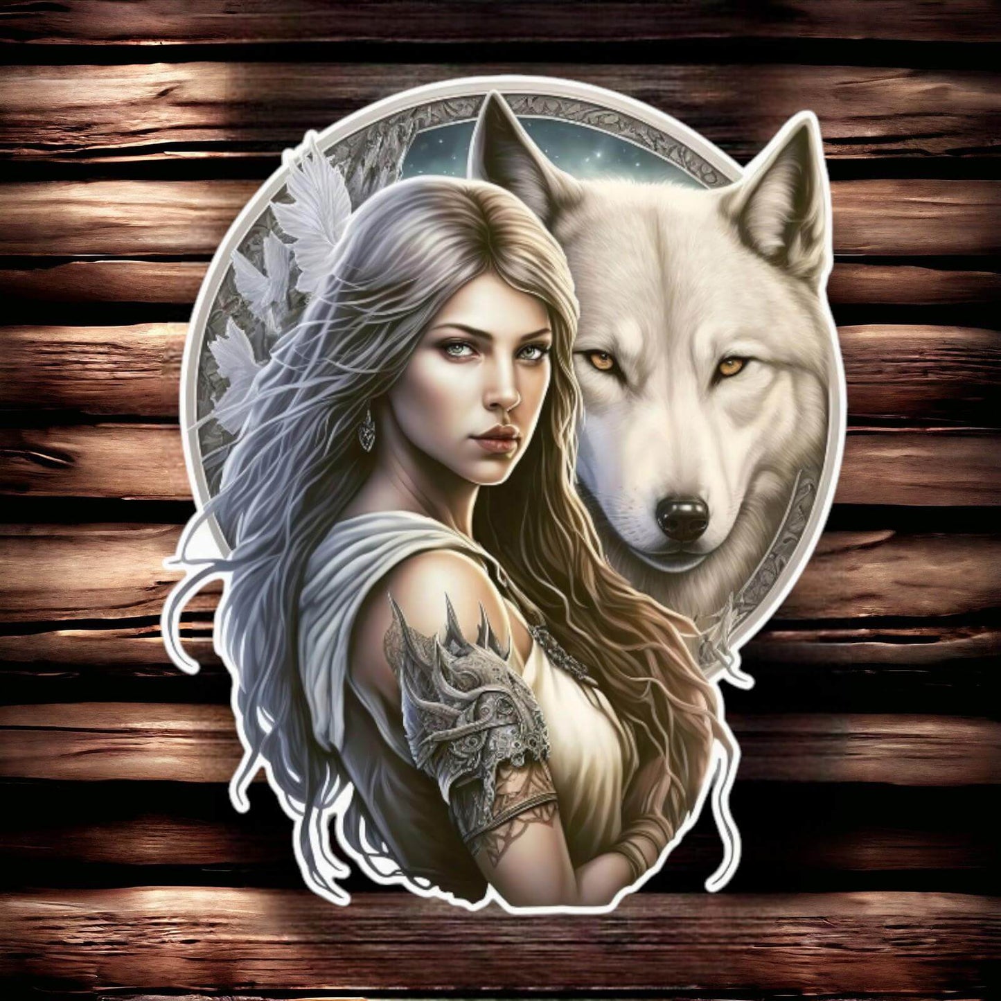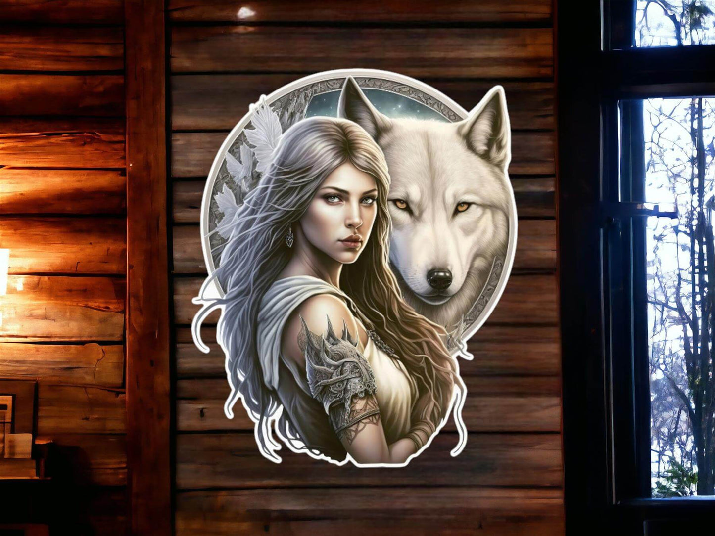Enchanting Wolf & Warrior Woman Wall Art - Mystical White Wolf Guardian Decor - Ethereal Female Spirit Metal Wall Sign - Fantasy Home Decor