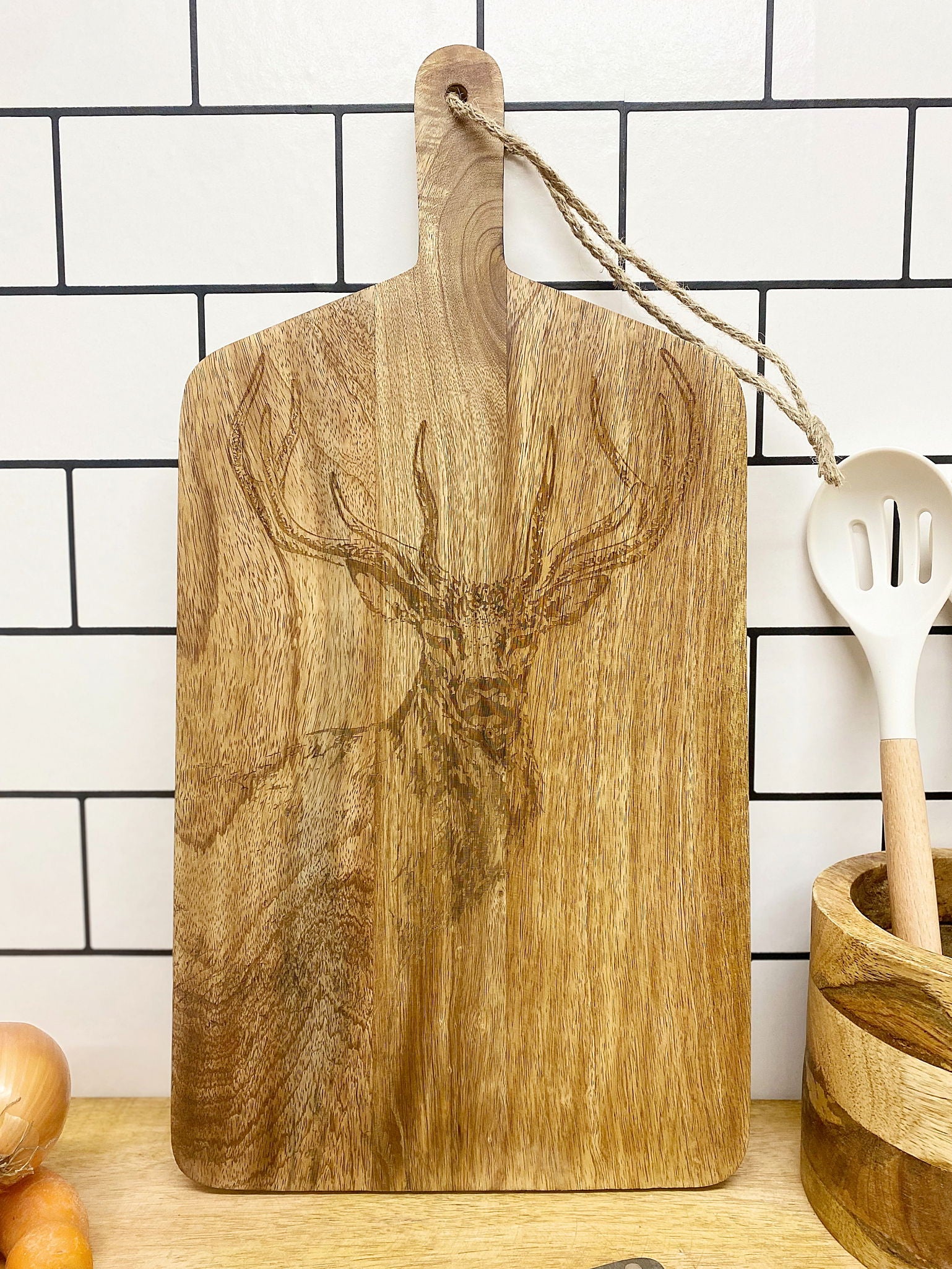 Measuring 50cm in length (including the handle), the board's main body spans a generous 36cm, offering ample space for all your chopping, slicing, and dicing needs. The engraved stag design dominates the surface, capturing attention and sparking conversation, whether you’re preparing a meal or displaying it in your kitchen.