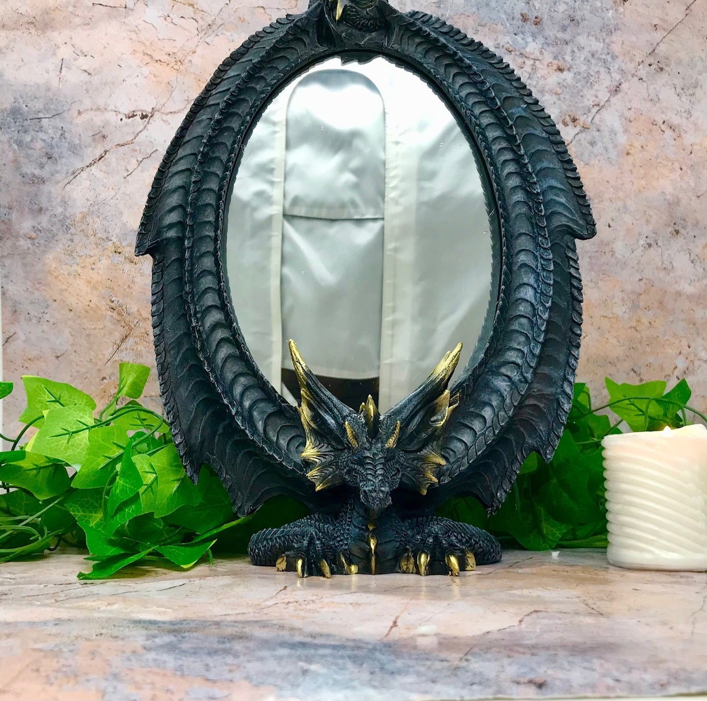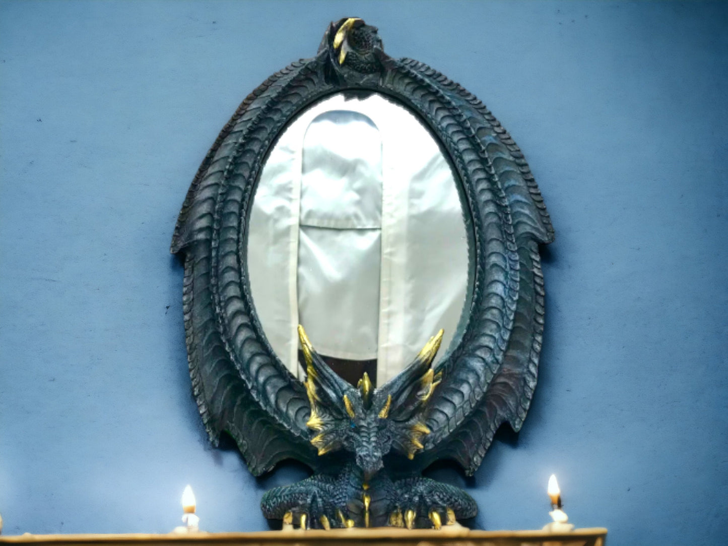 Each glance into this mirror will remind you of stories where dragons reigned the skies. The dark, serpentine figure that adorns its edges promises to protect the secrets it sees, a silent sentinel in your sacred space. Feel the transformative power of this mythical beast as it beckons prosperity and courage into your daily life. It's not just a piece to admire your reflection in; it's a statement—a spell cast to invite wonder and awe into every day. This dragon doesn't just reflect your image; it reflects your soul. Embrace the enchantment.