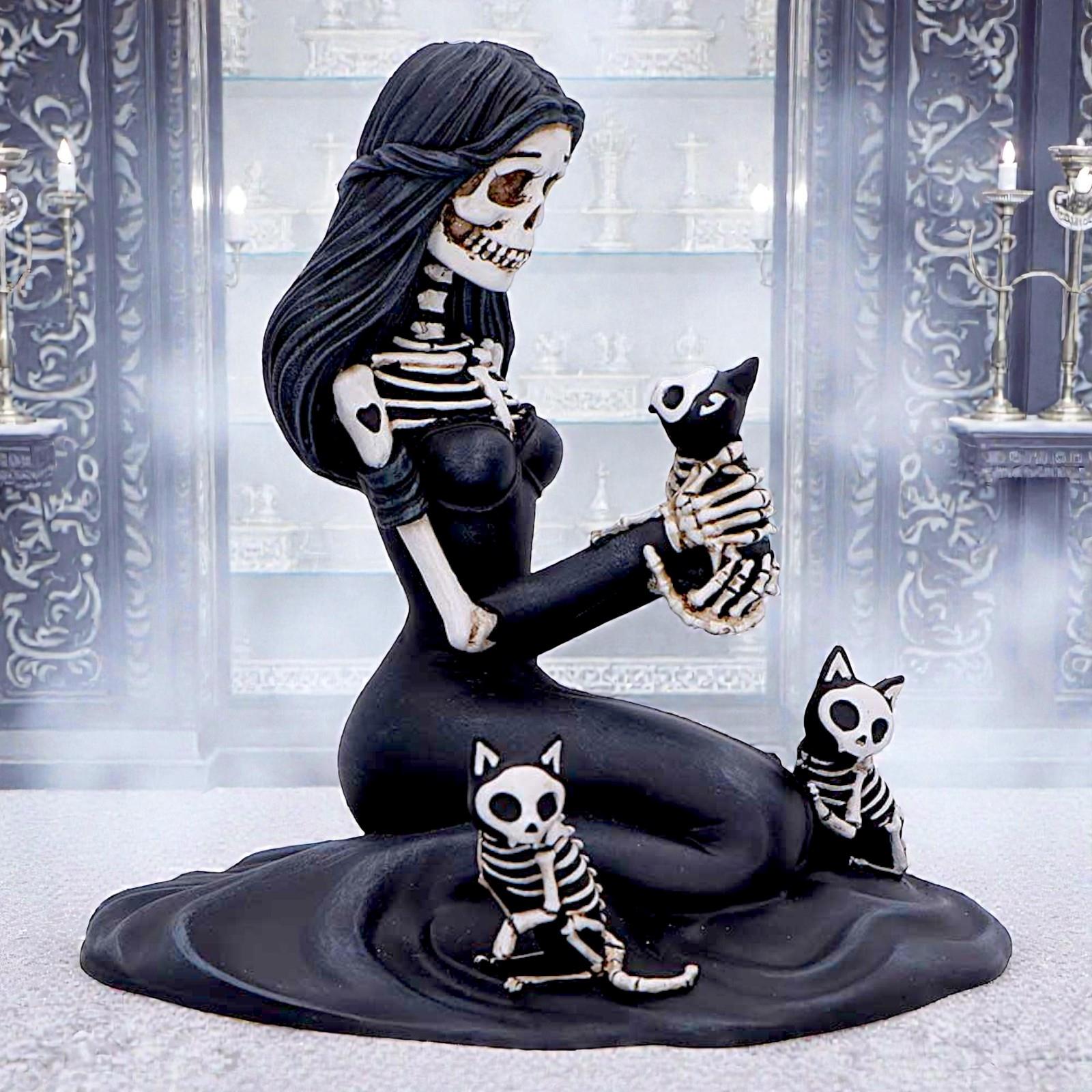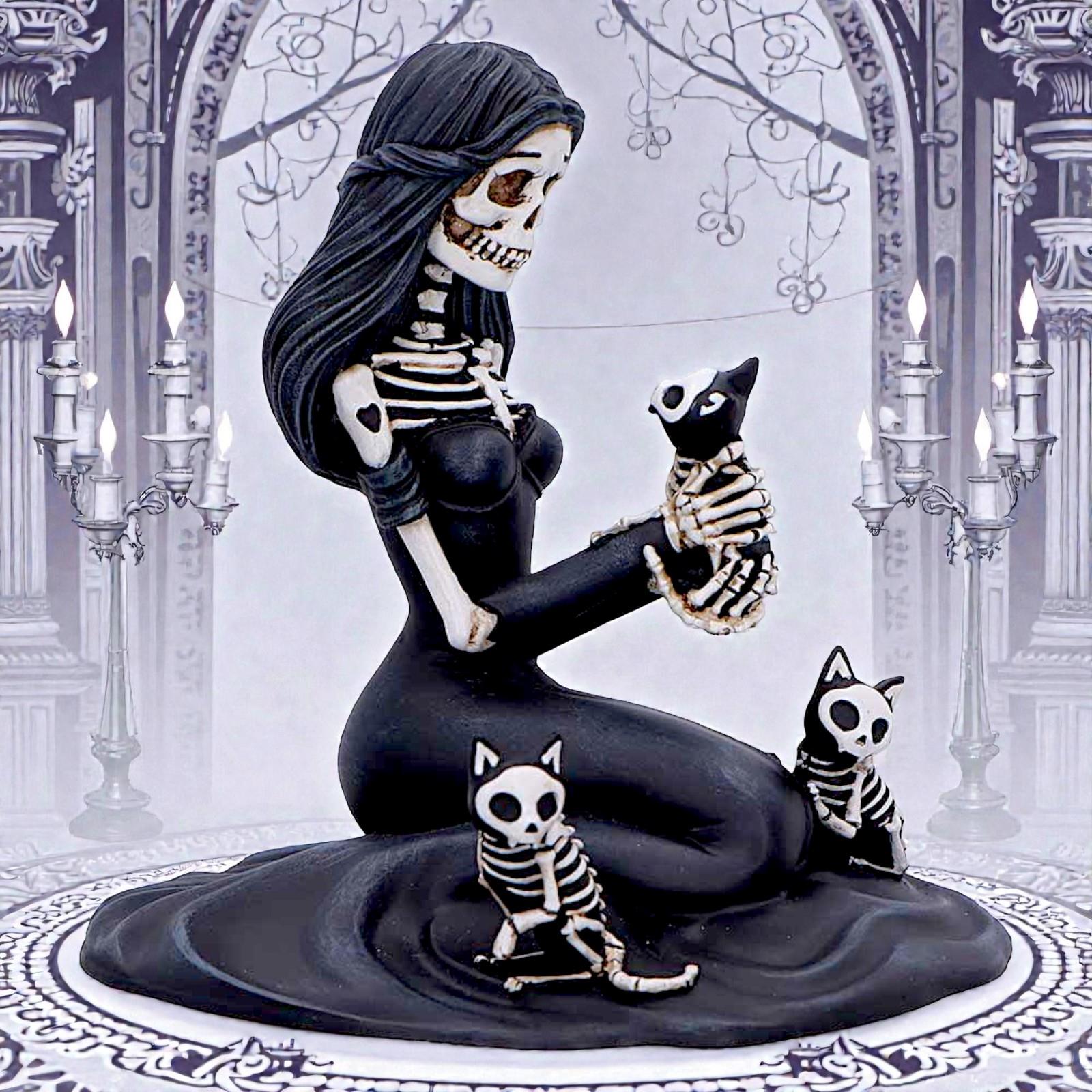 Expertly cast in high-quality resin and hand-painted to highlight every delicate detail, from the folds of her gown to the fine skeletal features of the cats, this figurine blends macabre artistry with emotional depth.