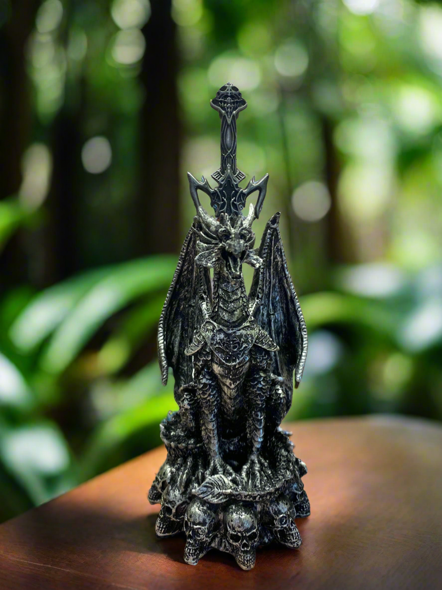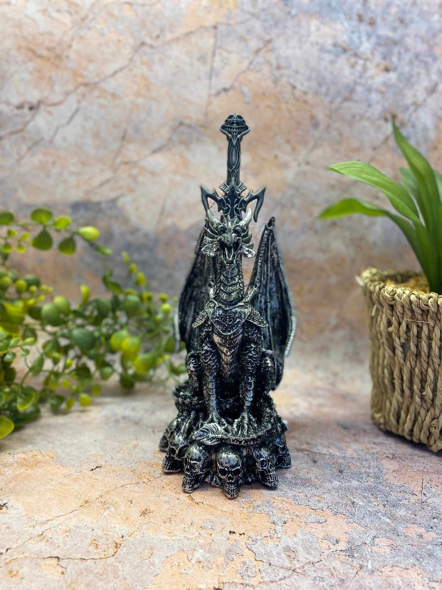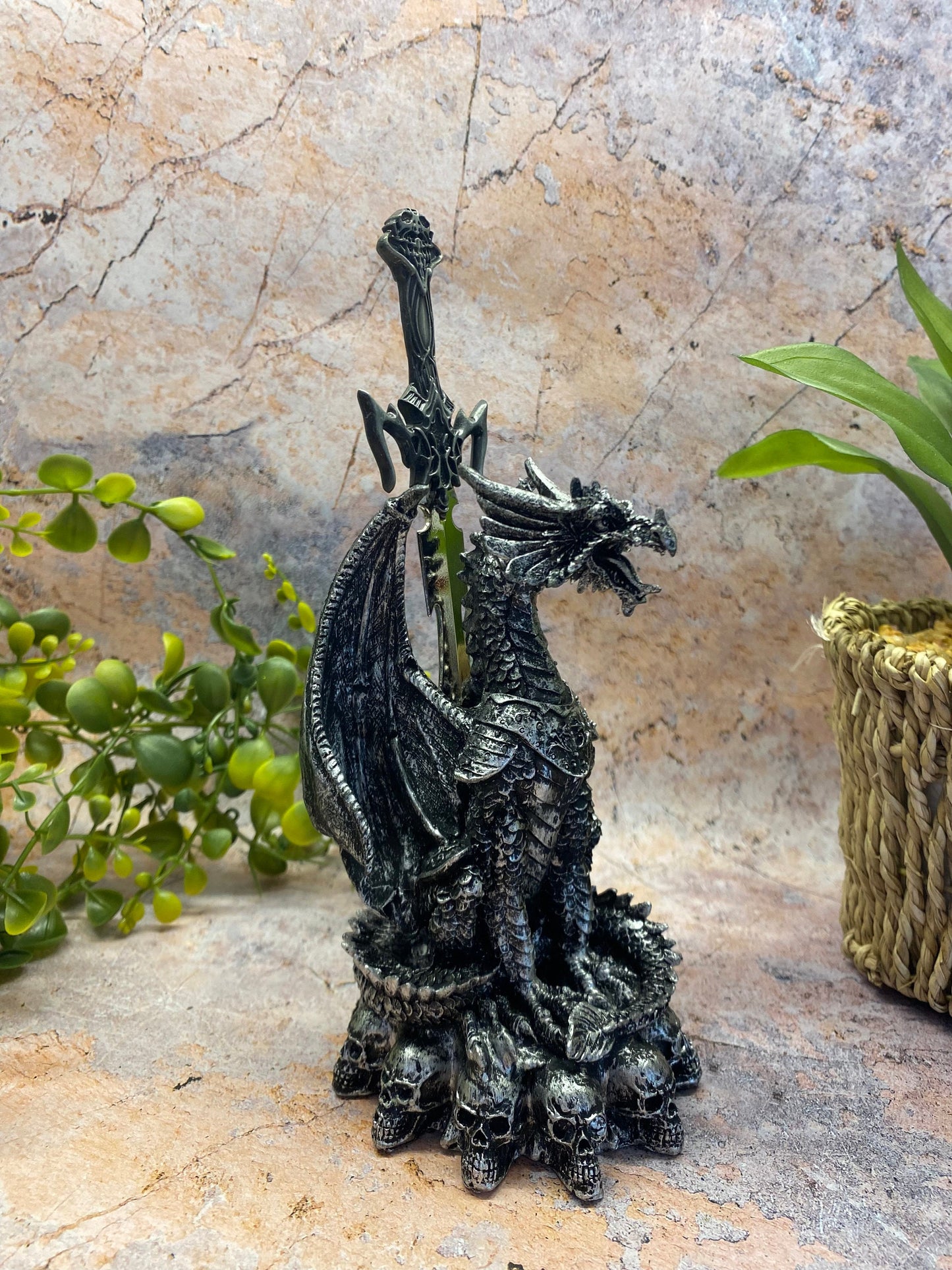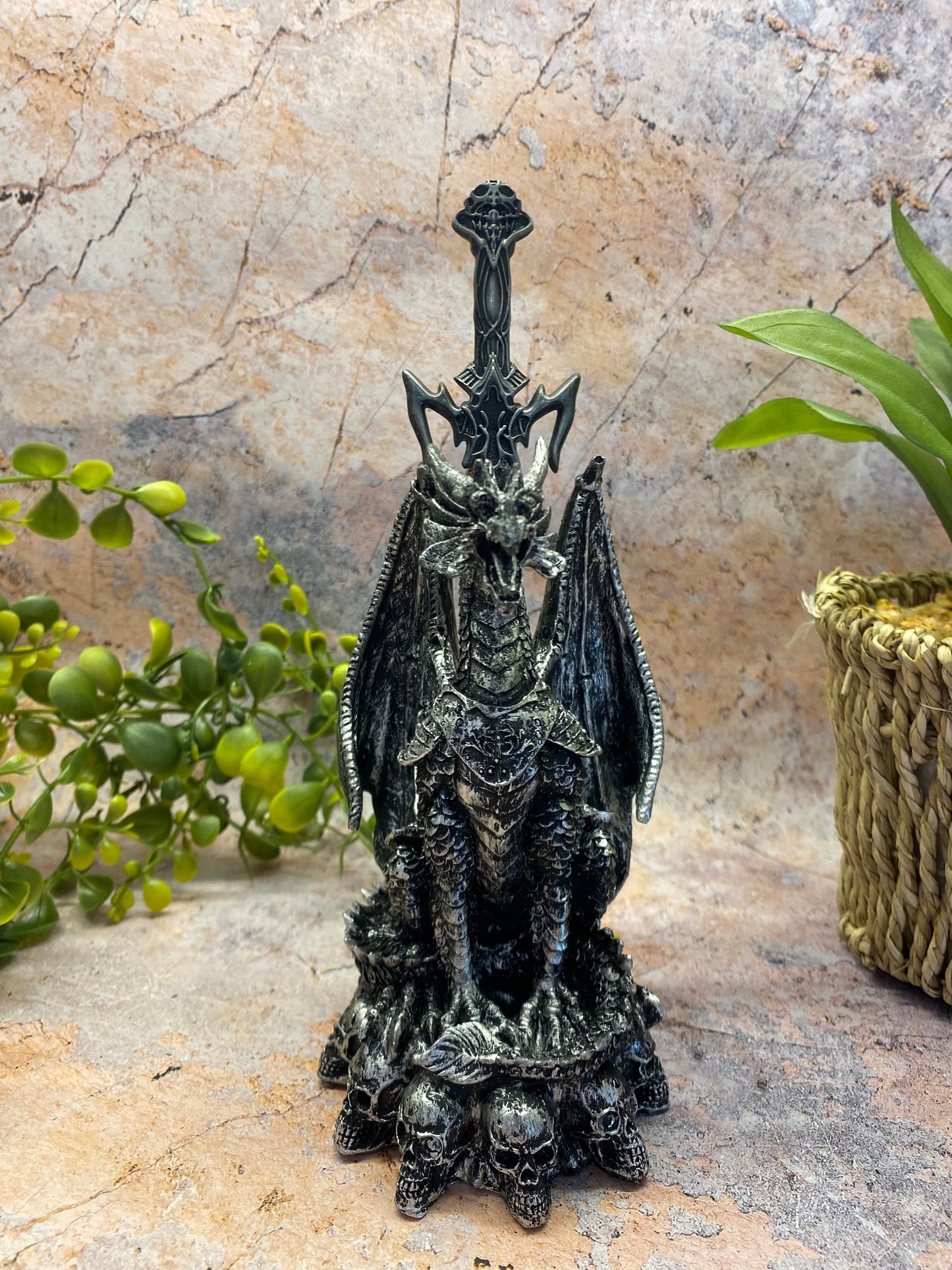 Introducing our exquisite Handmade Celtic Dragon Resting on Skulls Mythical Letter Opener, a true masterpiece inspired by the realms of fantasy and gothic decor. Standing proudly at a height of 28.5 centimetres, this captivating letter opener is meticulously crafted with utmost attention to detail.