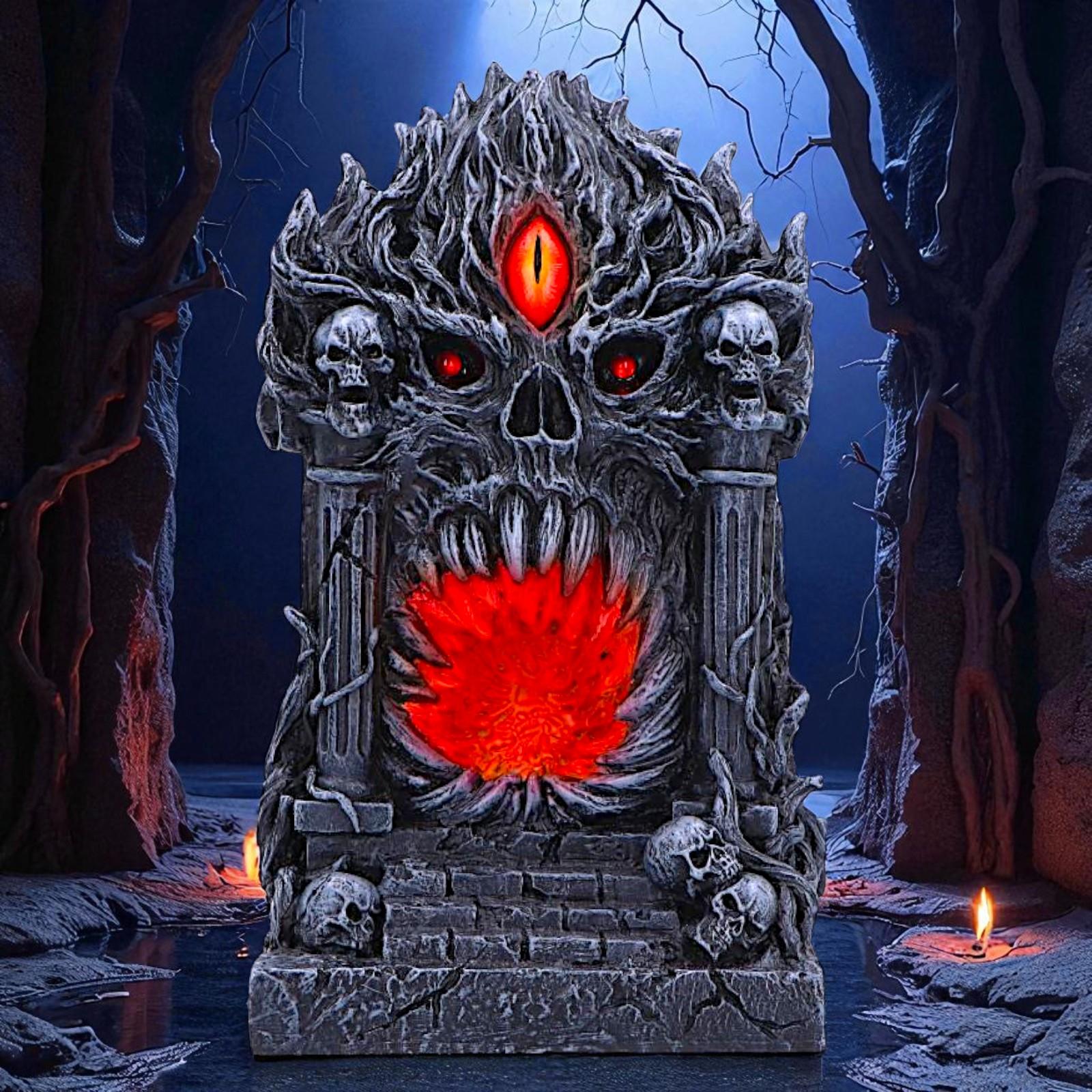 Intricately sculpted and cast in the finest resin, every eerie detail is captured—from the cracked stairs and twisted pillars to the gaping fanged maw and sinister skulls. The LED feature (powered by AA batteries, not included) lights up the mouth and eyes, adding a dramatic red glow that’s perfect for creating a spine-chilling ambience.