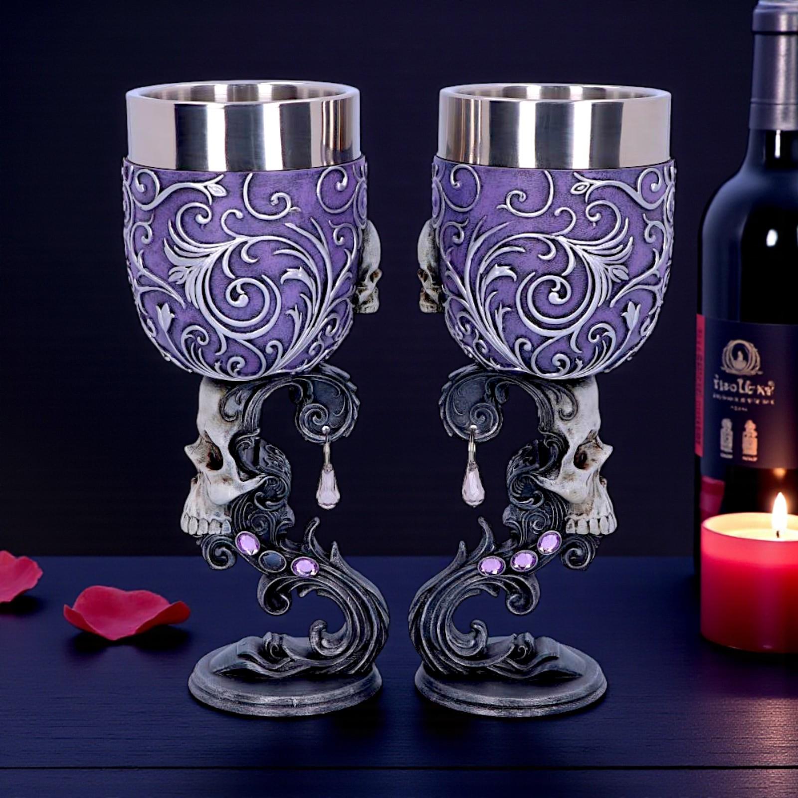 Each goblet features a highly detailed skull stem entwined with ornate baroque scrollwork and accented with shimmering purple jewels. When placed together, the stems unite to form the shape of a heart, symbolising eternal love beyond the grave.