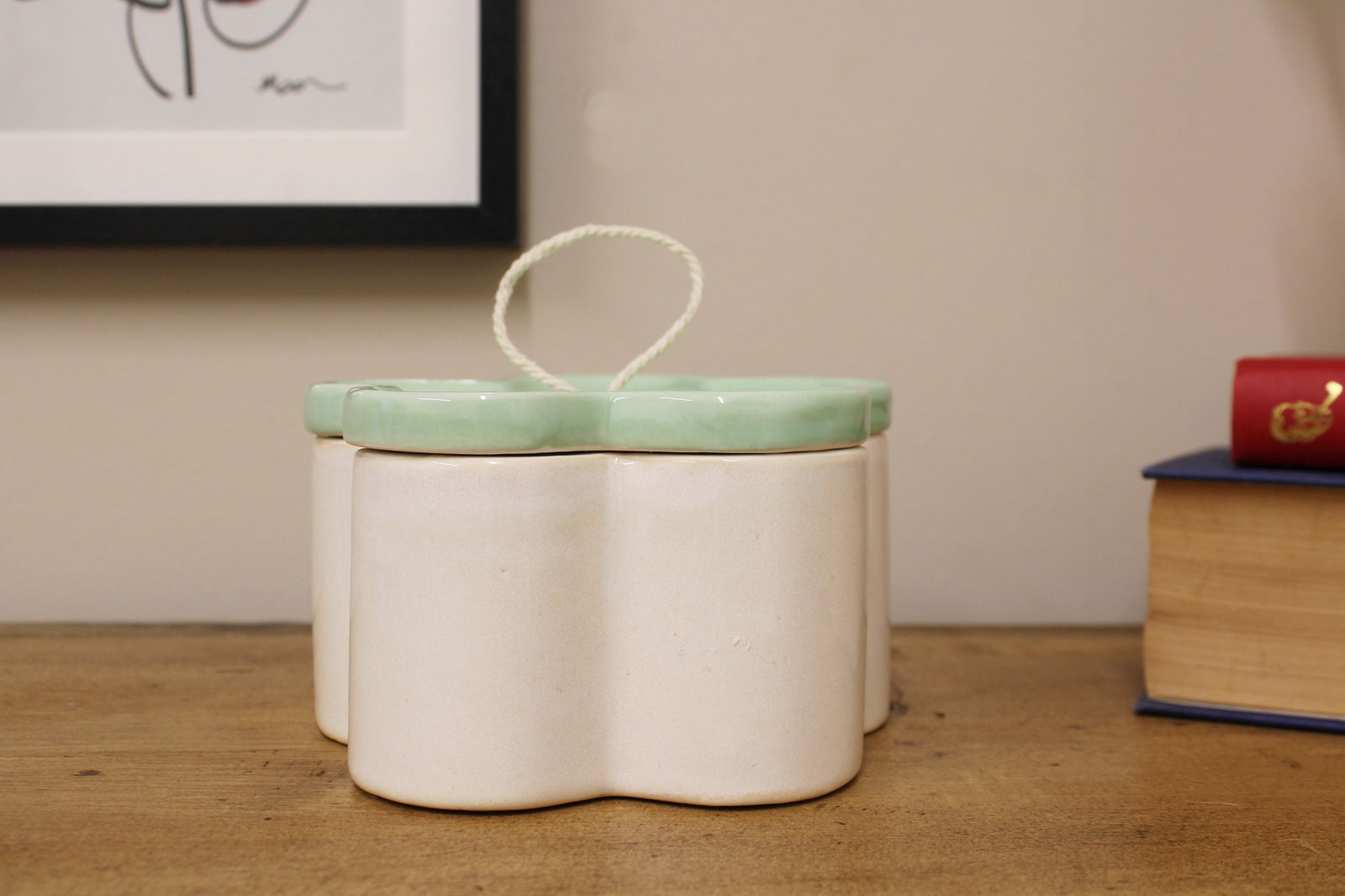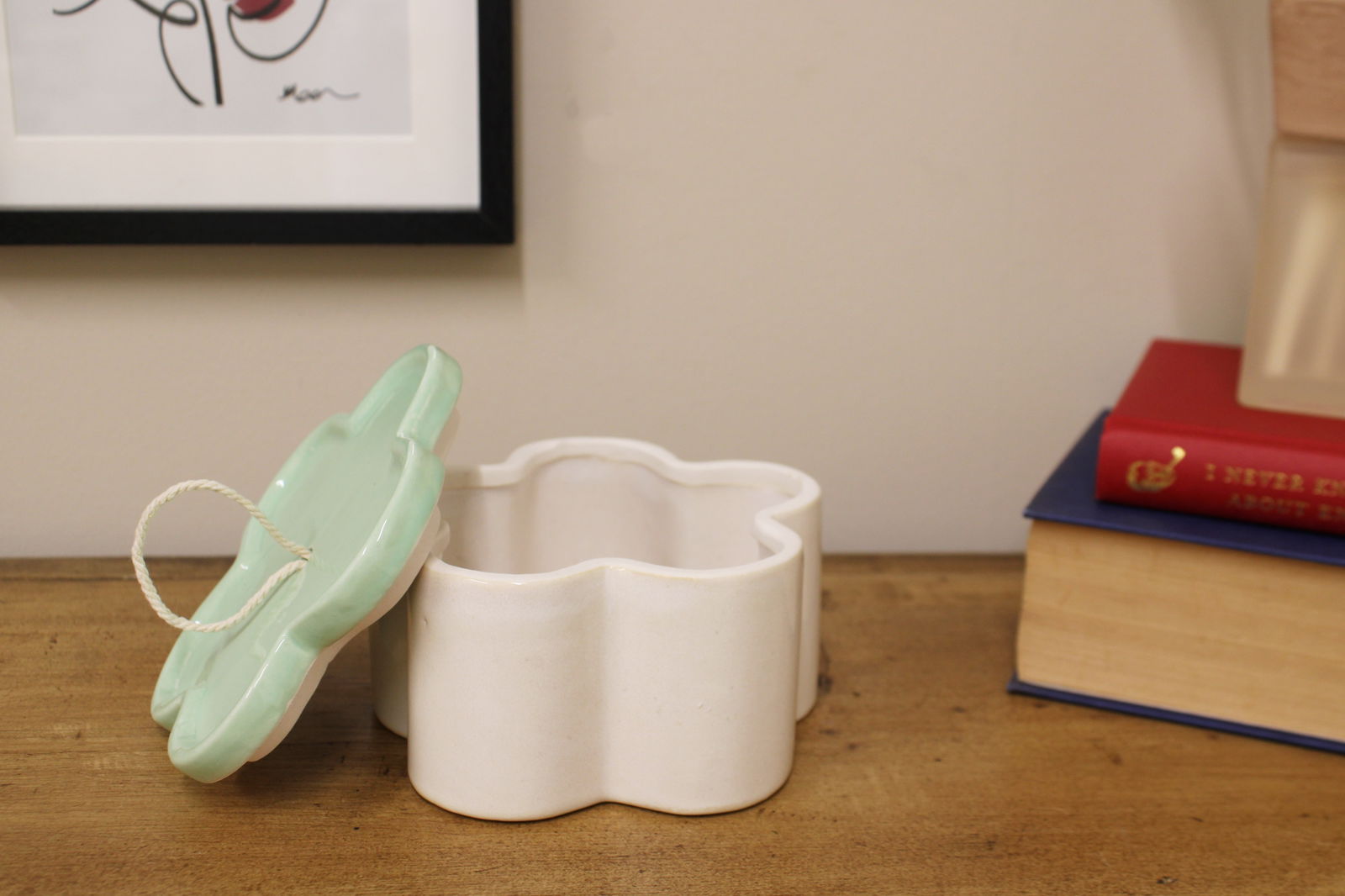 Measuring at D14 x H8 x W14cm, this trinket box is designed to fit perfectly on your vanity, dresser, or bedside table, where it can elegantly store your small vanity items, jewelry, or cherished keepsakes. The playful floral design adds a touch of whimsy to your space, while the soft green hue brings a sense of tranquility and freshness, reminiscent of a lush garden in full bloom.