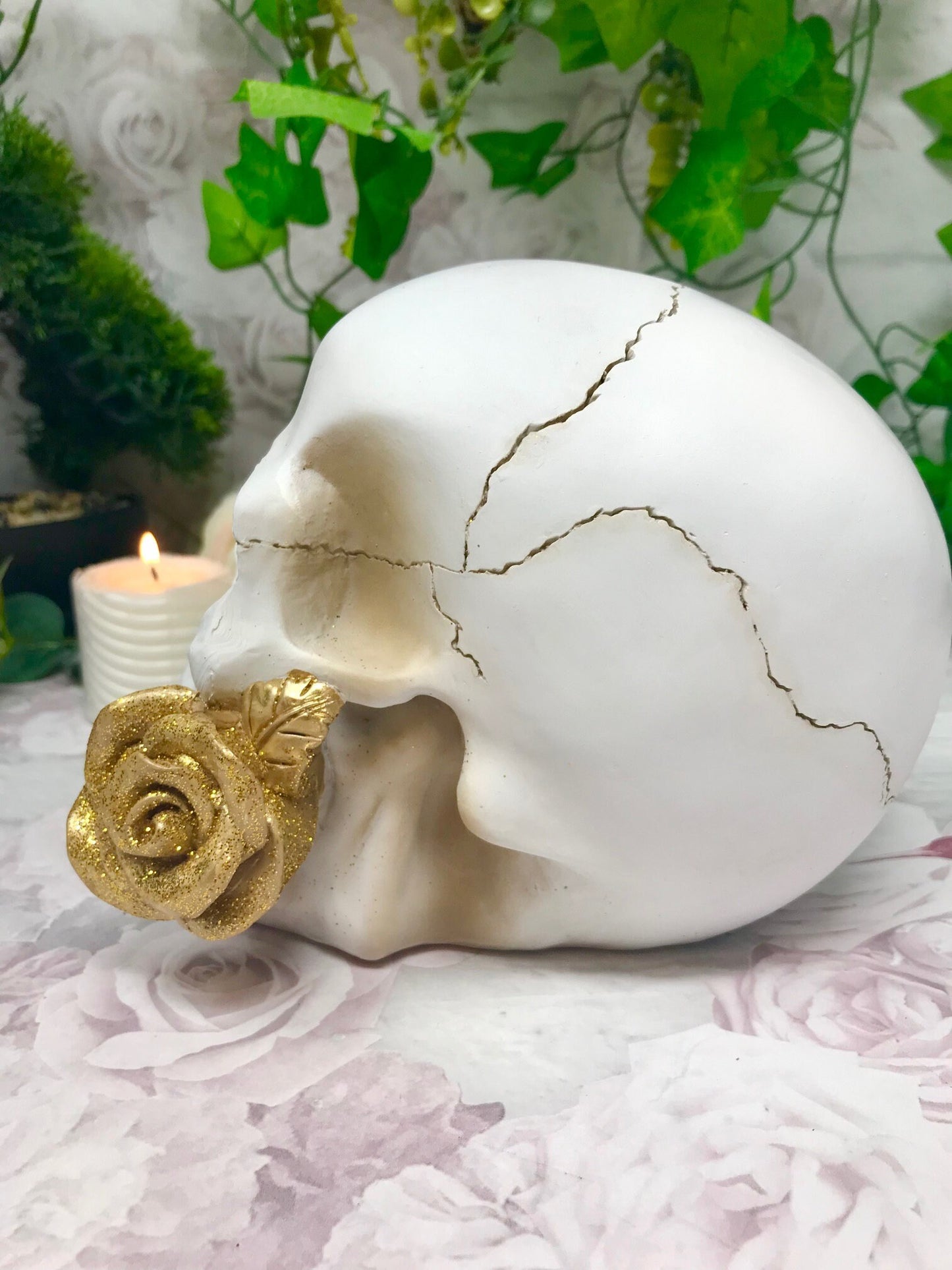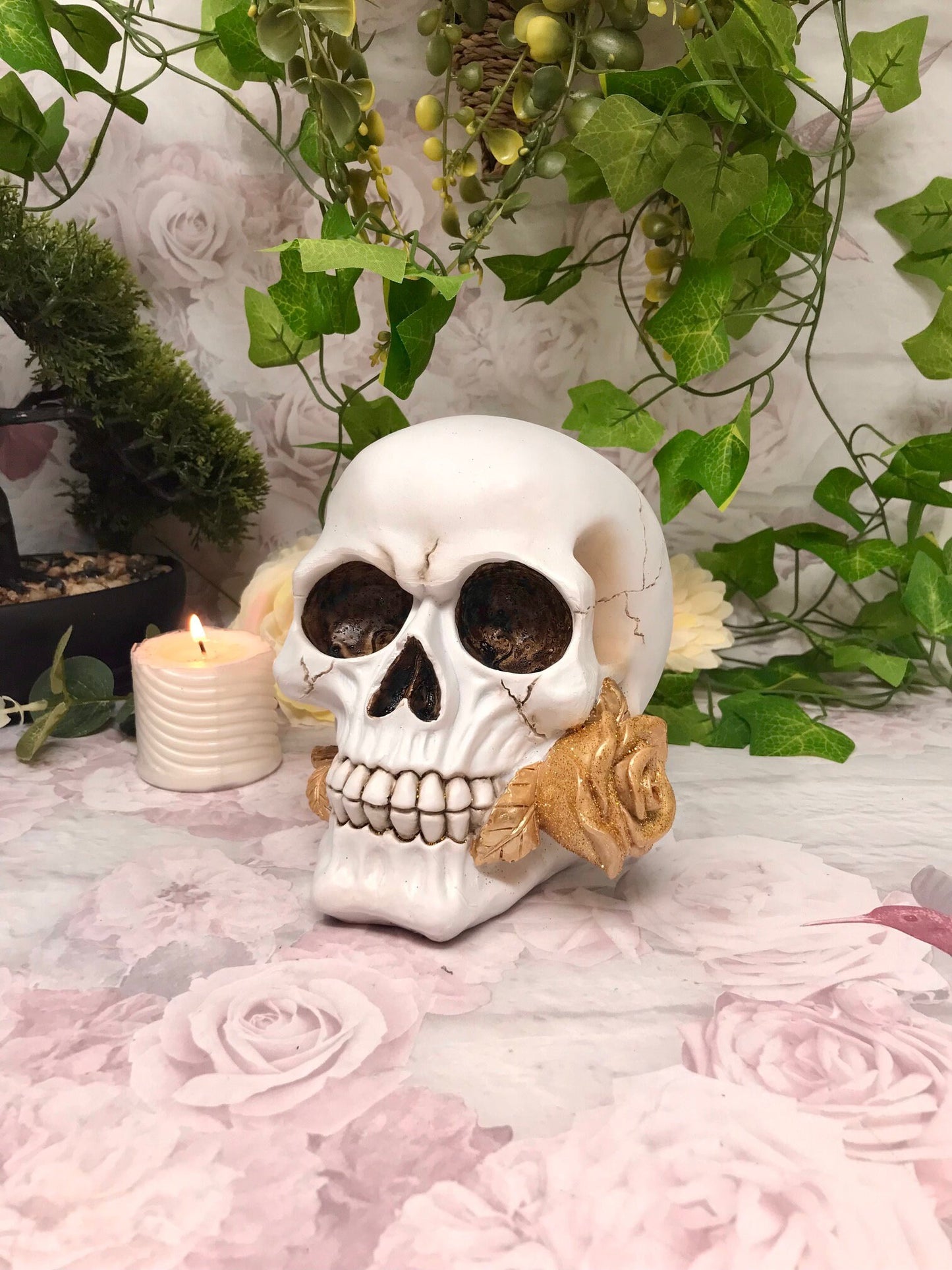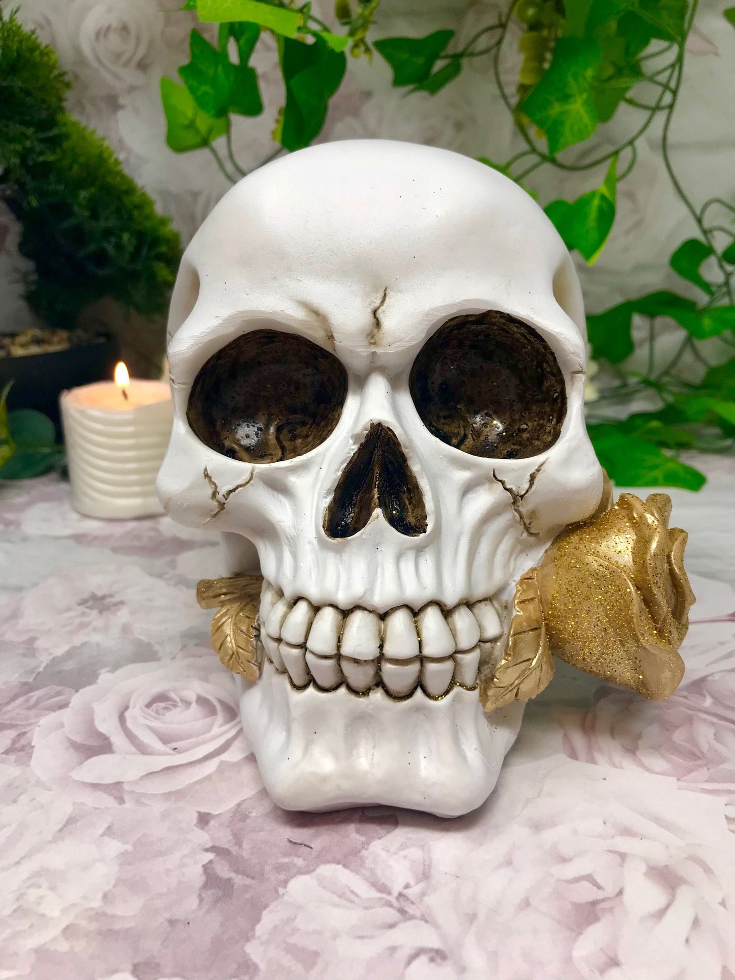 Gothic Decor: Ideal for lovers of gothic, macabre, and unique home decor items. This skull with a gold rose is perfect for creating a dramatic focal point in any room.