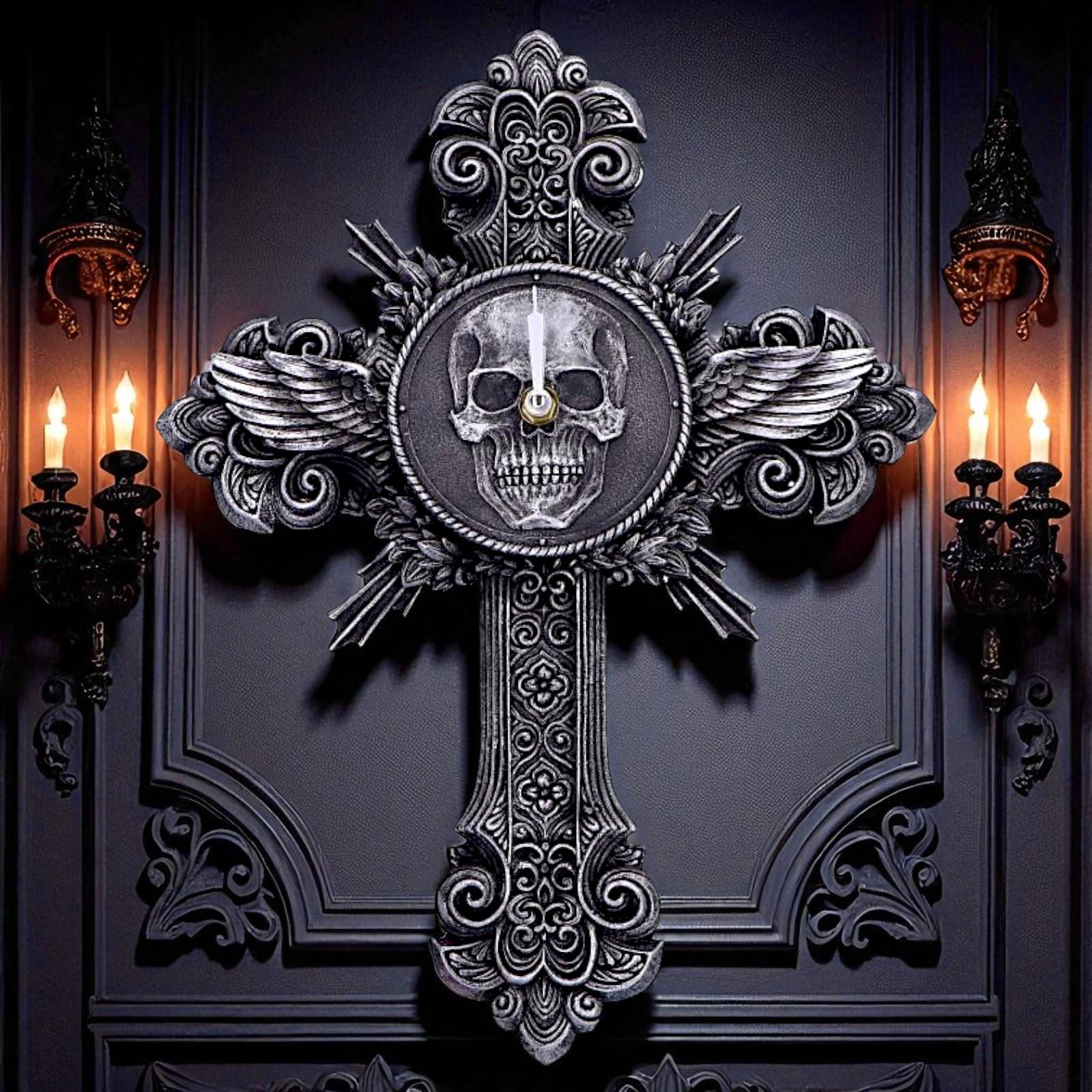 Add a bold statement to your gothic interior with the Horas Gothic Hanging Clock, a stunning fusion of macabre symbolism and practical design. This wall clock features a winged skull face set within an ornate silver cross, exuding dark artistry with every detail. Crafted from high-quality hand-painted resin, the intricate scrollwork and metallic finish make it both a functional timepiece and a dramatic piece of wall art.