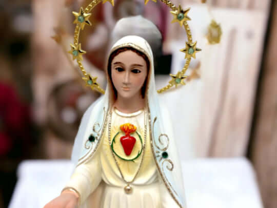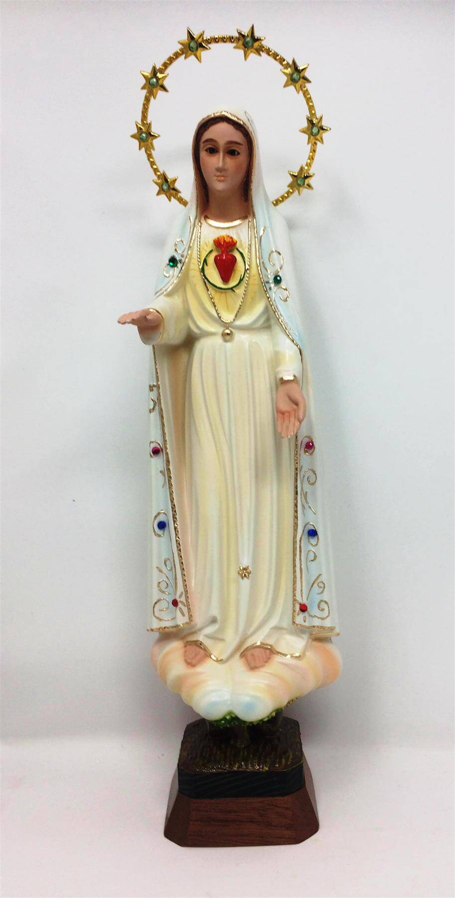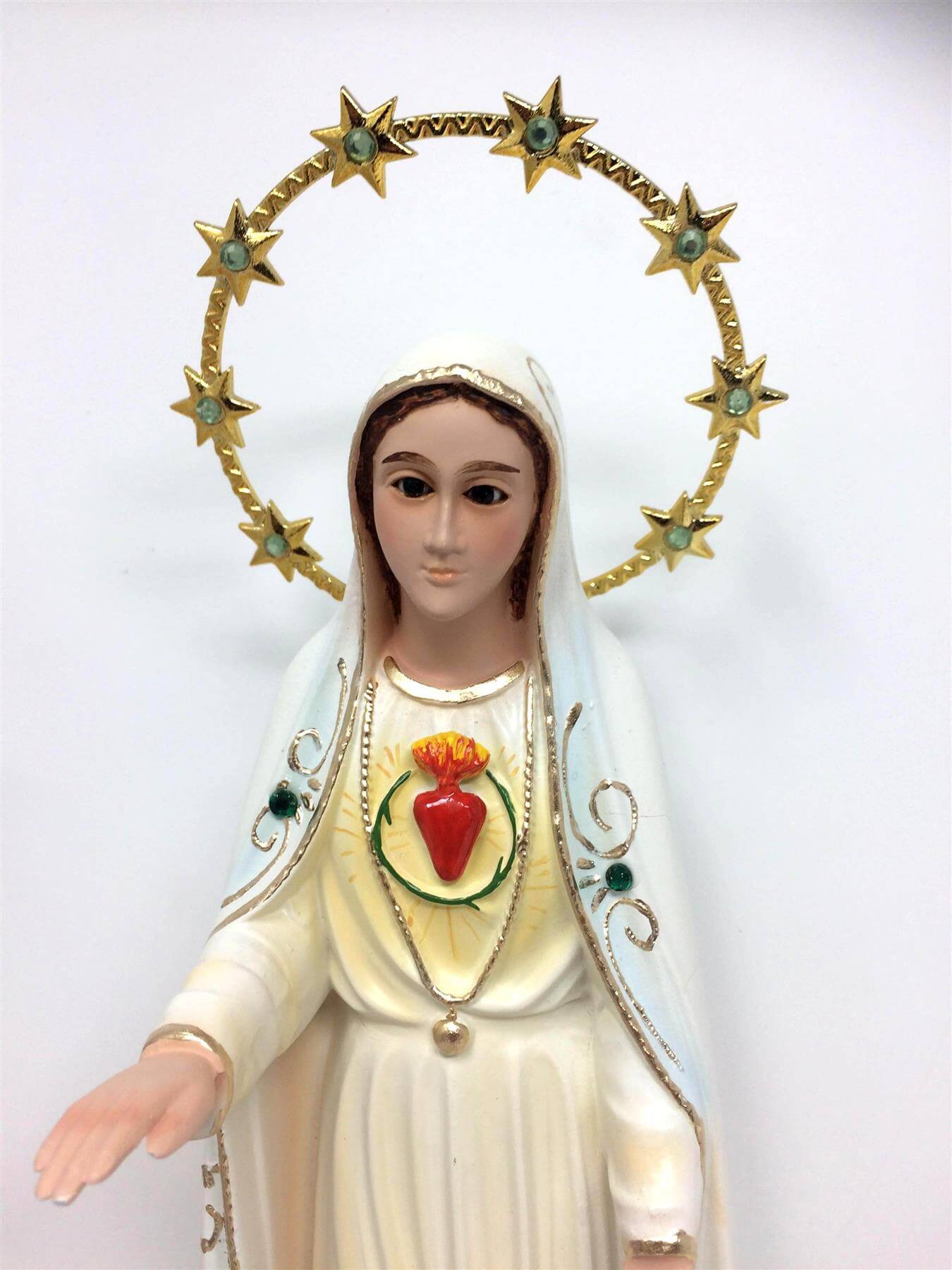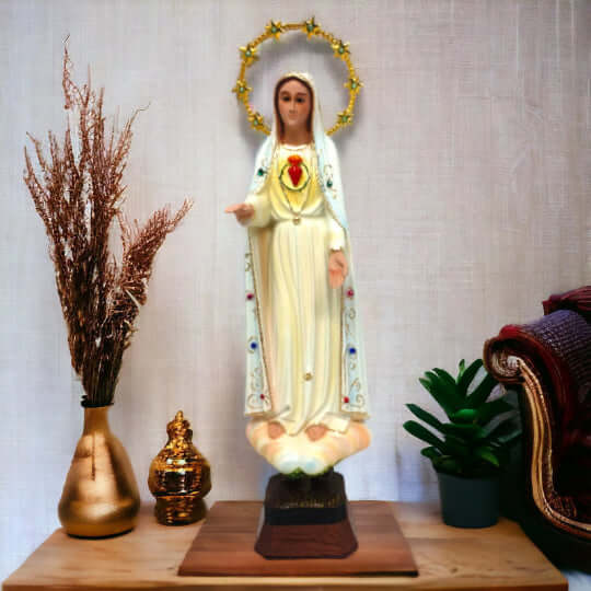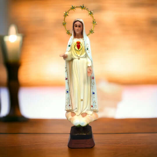 The statue showcases Mary, with her heart exposed, surrounded by a radiant halo of stars, illustrating her role as the Queen of Heaven and her immaculate love. The intricate details and vibrant colors highlight her grace, bringing peace and contemplation to your home.