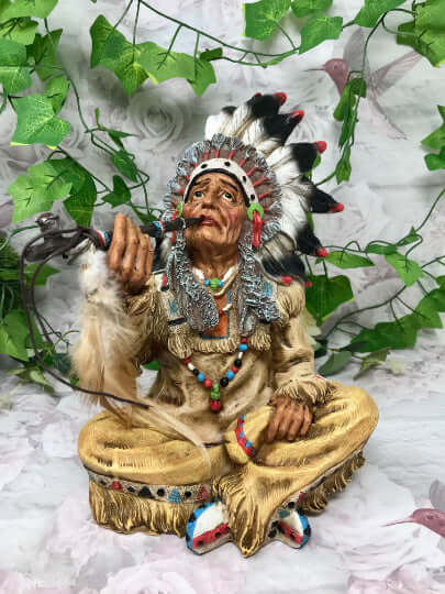 With an exquisite design and craftsmanship, this figurine depicts a traditional Indian chief sharing peace and tranquility through the ceremonial act of smoking a peace pipe. Every detail, from the feathers adorning his headpiece to the intricate patterns on his clothing, is carefully sculpted to perfection.