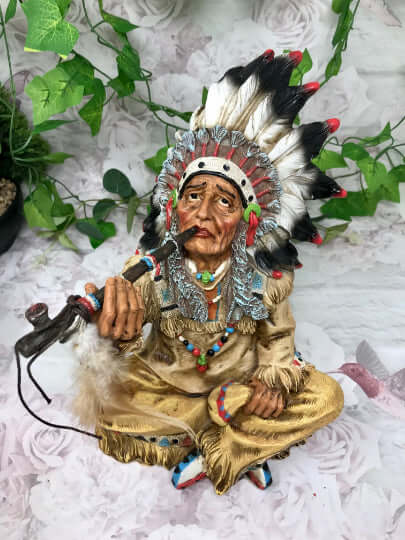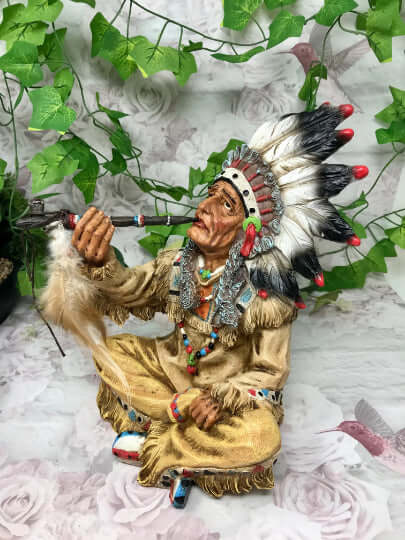 This unique piece comes boxed, making it an ideal gift for any collector or admirer of Native American culture. Whether displayed at home, in the office, or as a thoughtful present for a loved one, our Indian Chief Smoking a Peace Pipe Figurine is sure to evoke a sense of history, tradition, and reverence for the indigenous peoples of North America. Add this striking sculpture to your Native American collection today and embrace the rich heritage of the Indian Chief.