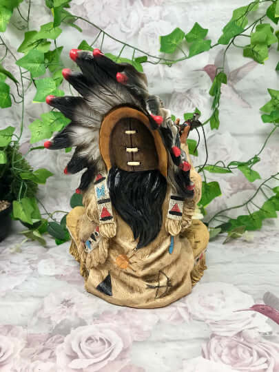 Unleash the spirit of the Native American culture with our stunning Indian Chief Smoking a Peace Pipe Figurine. Standing at 21.5 x 18 x 25 cm, this handcrafted sculpture is made of cold cast resin, ensuring durability and intricate detailing that captures the essence of Native American artistry.