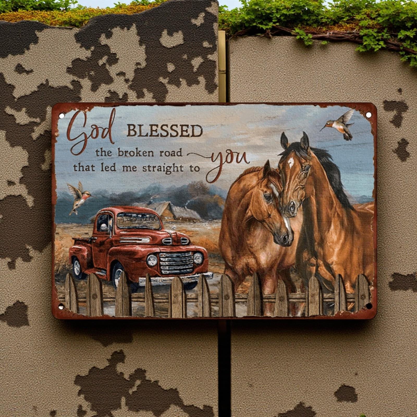 Bring warmth, faith, and rustic charm into your home with this “God Blessed the Broken Road” Metal Wall Sign. Measuring 30 x 20 cm, this vintage-inspired plaque features two horses beside an old red truck, set against a scenic countryside backdrop.