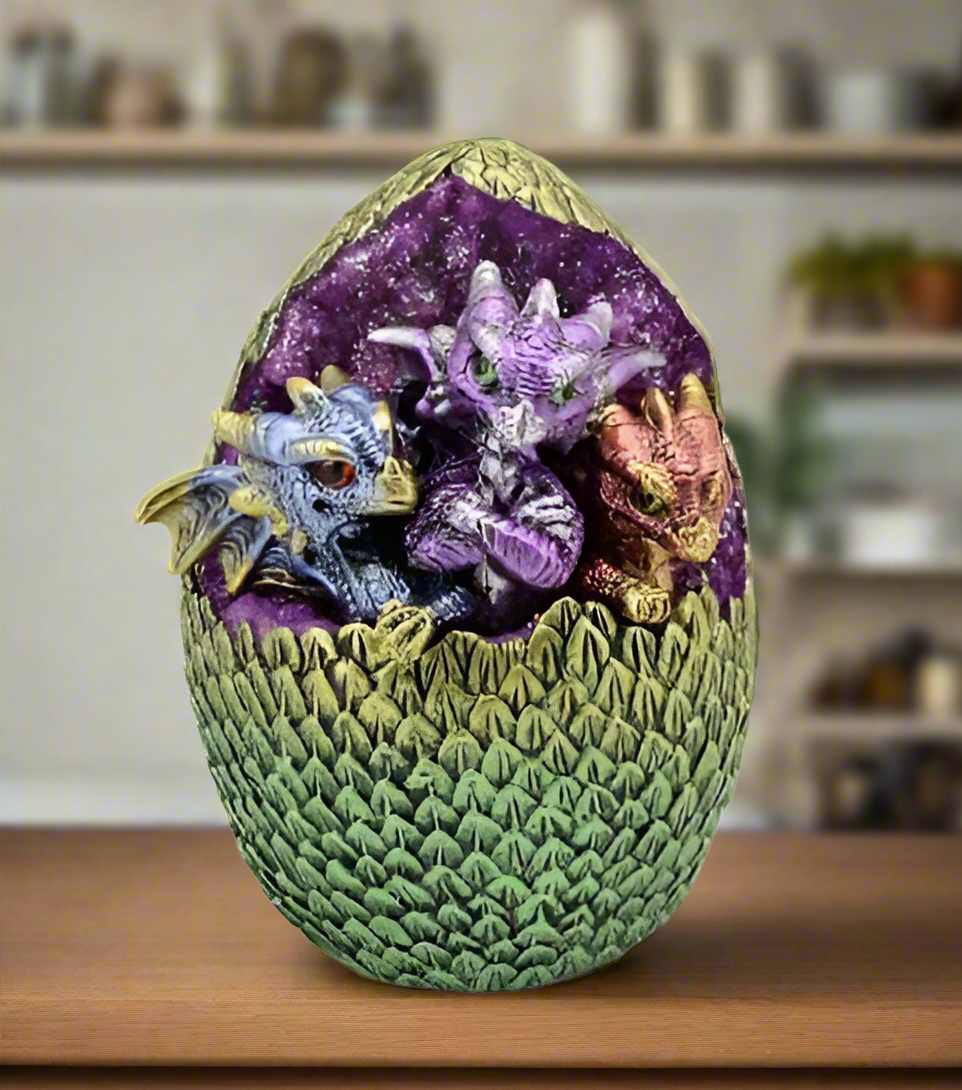 Bring enchanting magic to your home with this stunning LED Dragon Hatchlings in Egg Ornament. Made from high-quality resin, this 11.8 cm x 15.2 cm collectible features three detailed baby dragons nestled in a textured egg, illuminated by an LED light that brings the scene to life. Perfect as a decorative piece for fantasy lovers or as a unique gift.