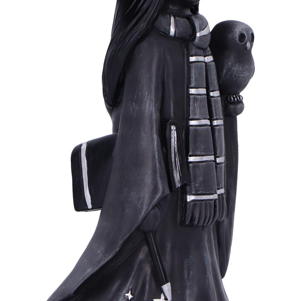 She holds a mystical wand and carries a spellbook, while a wise little owl companion perches gently on her arm — symbolising ancient knowledge and protection. The matte black finish with silver highlights gives this figurine a clean gothic aesthetic while retaining a heartwarming charm.