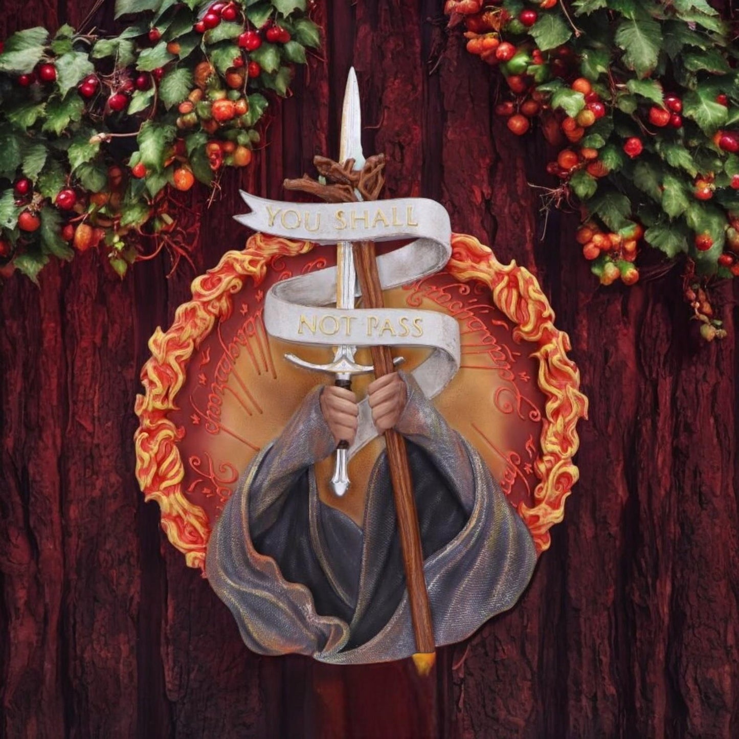 Bring the magic of Middle-Earth into your home with this stunning Lord of the Rings "You Shall Not Pass" wall plaque. Featuring the iconic moment where Gandalf the Grey bravely defies the Balrog, this intricately designed plaque is a must-have for any LOTR fan or collector.