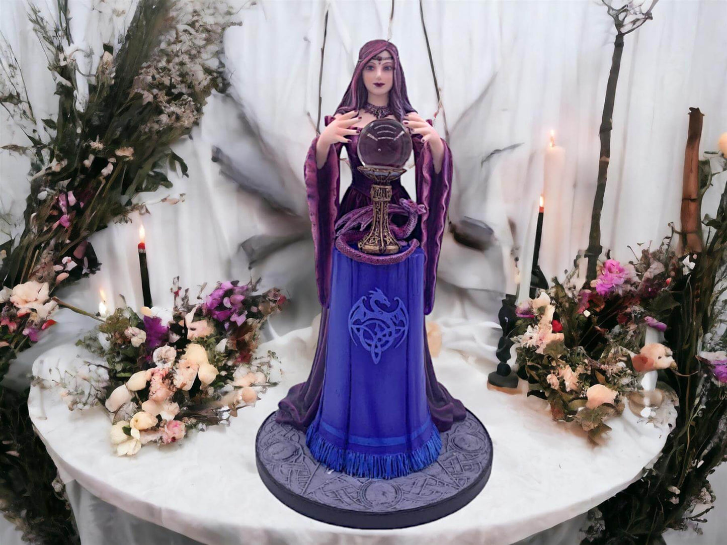 Her crystal orb, a beacon of foresight, may just draw you into a reflective trance, contemplating the mysteries of the future. Whether as a gift for a lover of fantasy and the arcane or a treat for your sanctuary, this figurine is more than an object; it's an experience waiting to resonate with the soul.