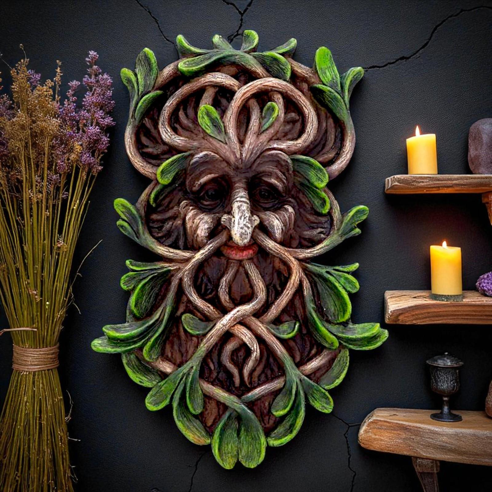 Intricately designed with twisting roots and fresh green leaves forming a wise and serene face, this forest guardian wall plaque is perfect for adding a rustic, pagan, or fantasy element to any space. Ideal for both indoor and outdoor décor, this unique resin sculpture makes a thoughtful gift for nature lovers, druids, or anyone with a love for myth and folklore.