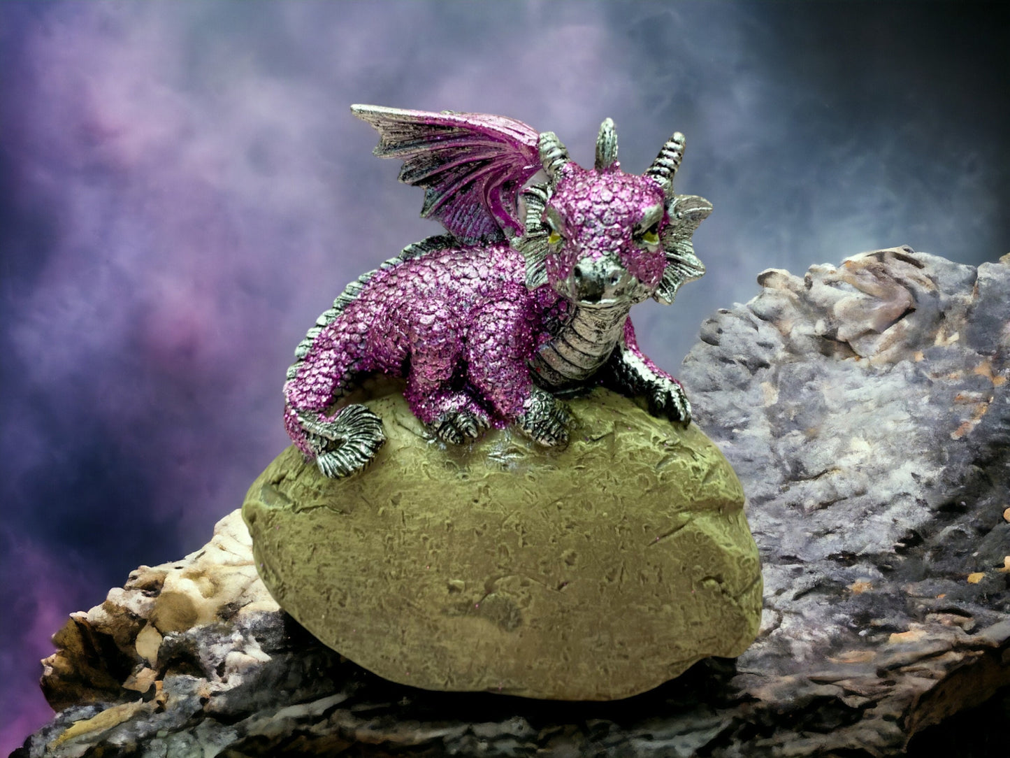 This figurine captures the mythical essence of dragons with its vibrant purple scales and an ethereal pose that seems to watch over your realm with wisdom and grace. The shimmering purple is contrasted beautifully against the earthy tones of the rock, highlighting the dragon's majestic and otherworldly presence. Each scale and spike is carefully sculpted to catch the light and create a lifelike appearance that will captivate any viewer.
