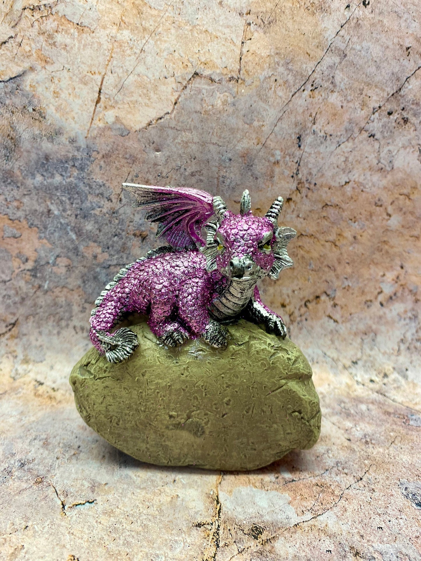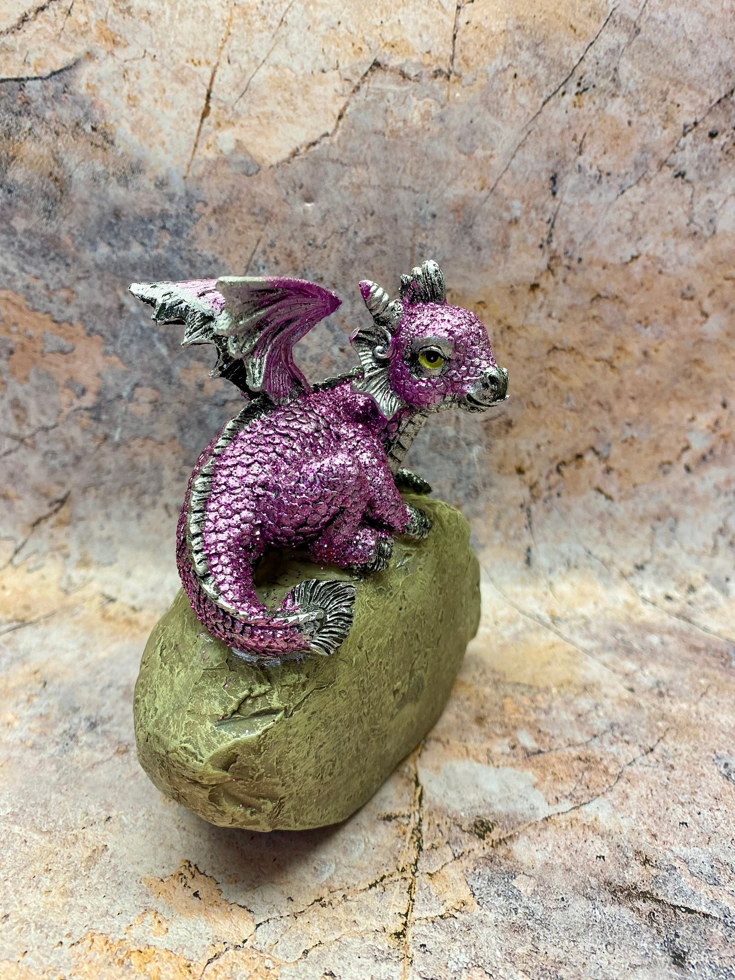 Embark on a journey into the realm of fantasy with this enchanting Purple Dragon Figurine, perched majestically on a rugged rock. Crafted from premium resin for durability and meticulous detail, this statue stands at 13 cm tall, making it a perfect addition to any dragon collector's display or a magical accent in a themed room.