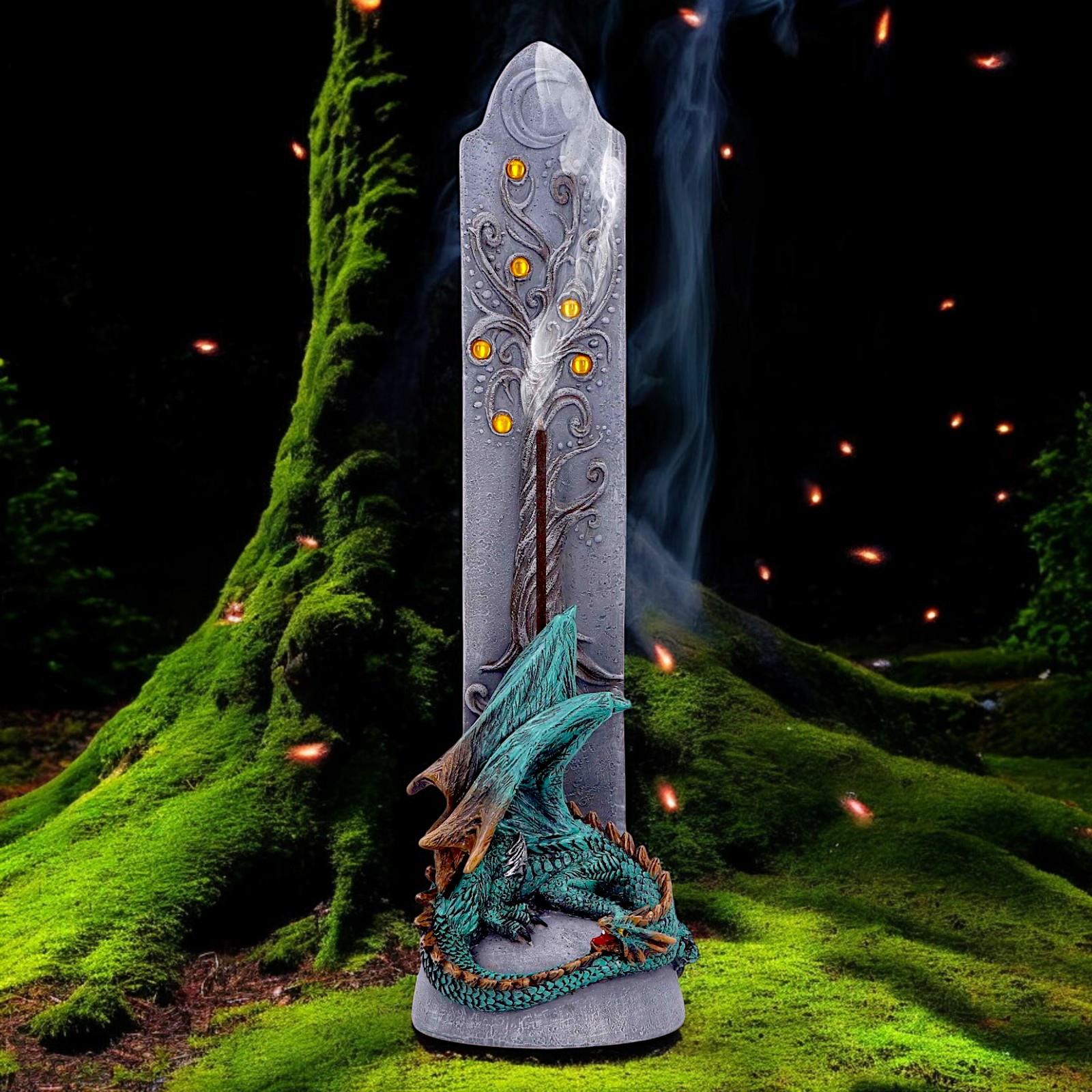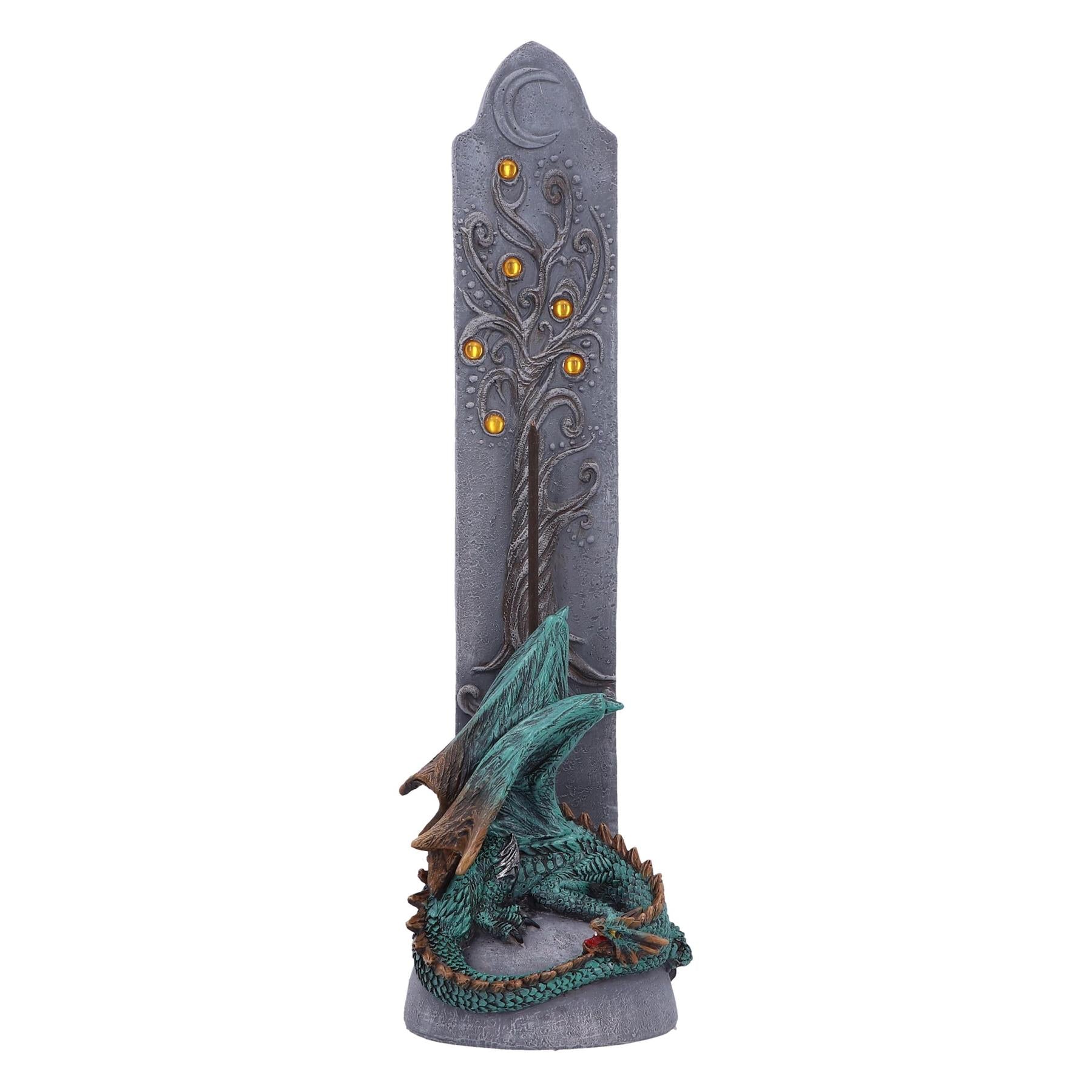 Crafted from premium quality resin and expertly hand-painted, this burner features a sleeping green dragon wrapped peacefully around the base of a mystical vertical pillar engraved with a crescent moon and adorned with amber-like gemstones forming a magical tree motif. Measuring approx. 27cm tall, it's designed for stick incense, allowing the smoke to curl up gracefully, adding a serene ambiance to any room.