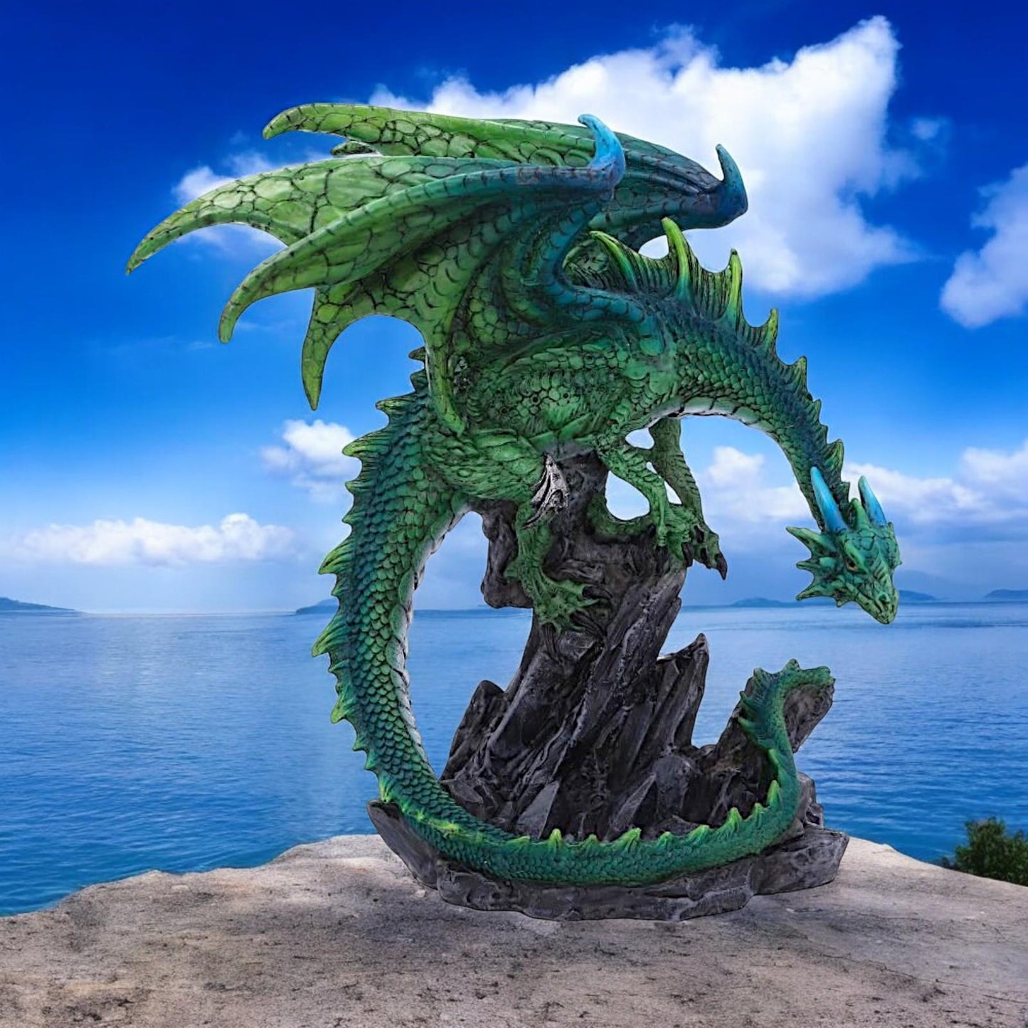 Add a touch of mysticism and elegance to your decor with this expertly crafted Green Dragon Figurine. Perched majestically on a rocky outcrop, this dragon is cast in premium-quality resin and features meticulous hand-painted detailing. At 21cm tall, it's a stunning addition to any dragon lover's collection or a perfect gift for fantasy enthusiasts.