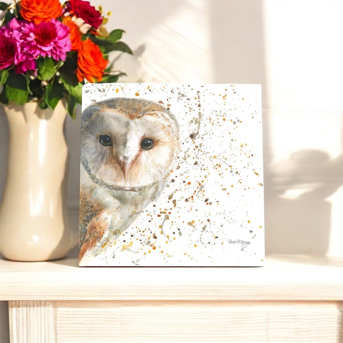 Bring nature indoors with the charming "Olive Owl" ceramic art tile by renowned wildlife artist Bree Merryn. This 20x20 cm ceramic tile features a detailed and captivating portrayal of a barn owl, perfect for adding a touch of wildlife elegance to your home decor. The delicate splashes of color create a lively backdrop that complements the owl's soft feathers, making it a striking piece of wall art.