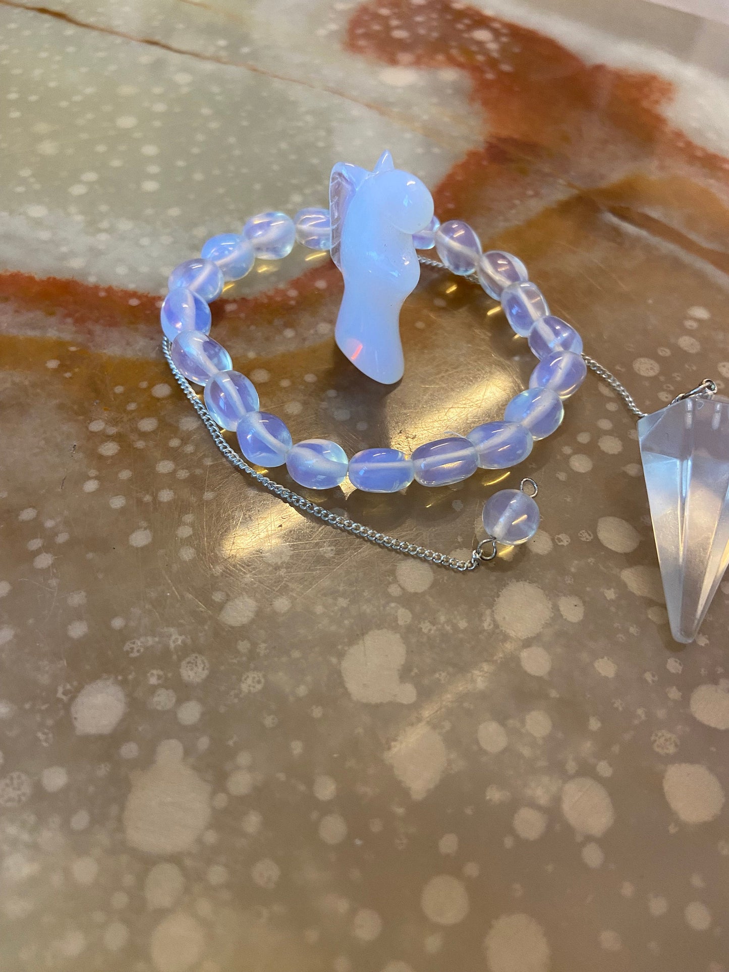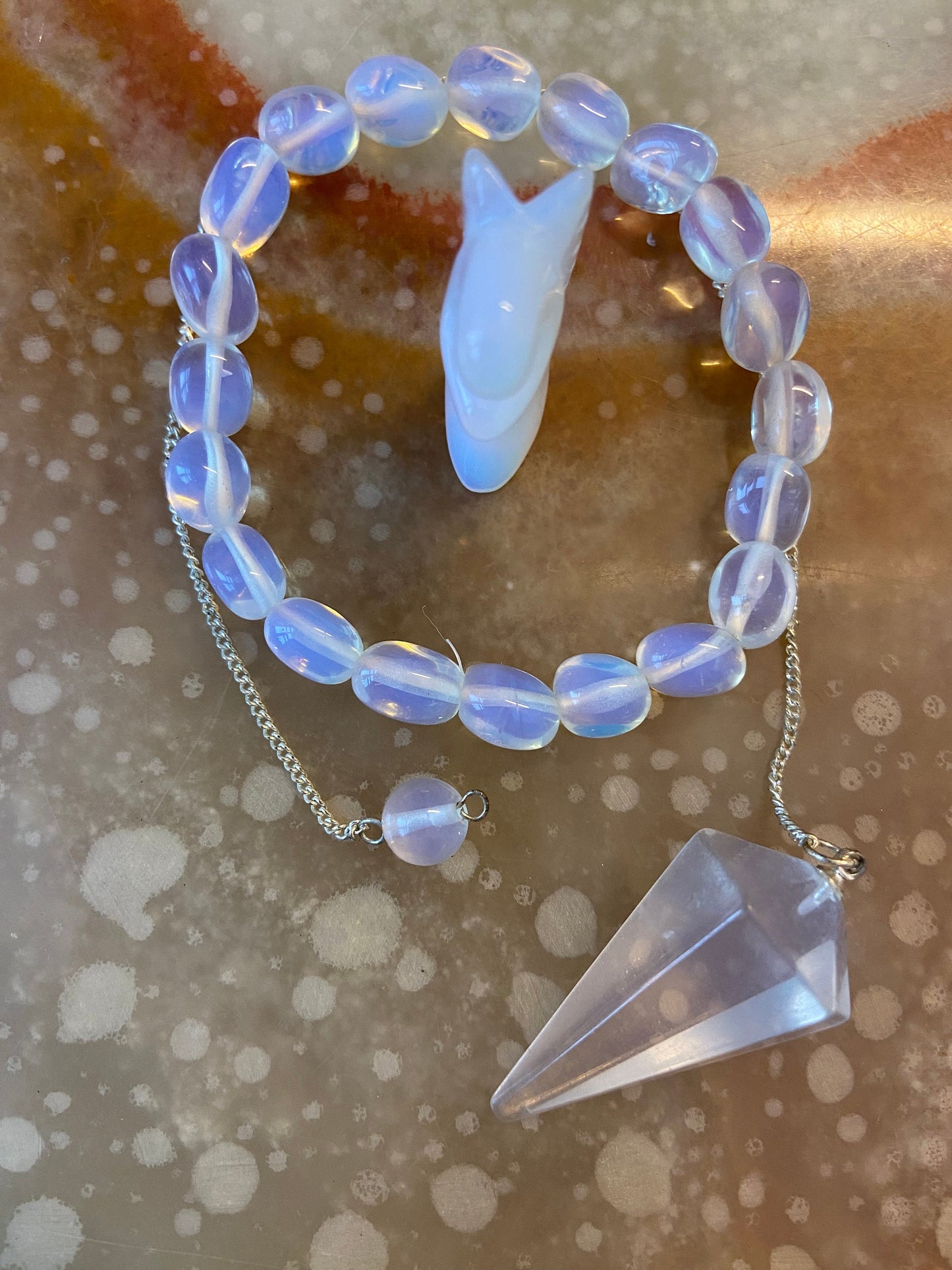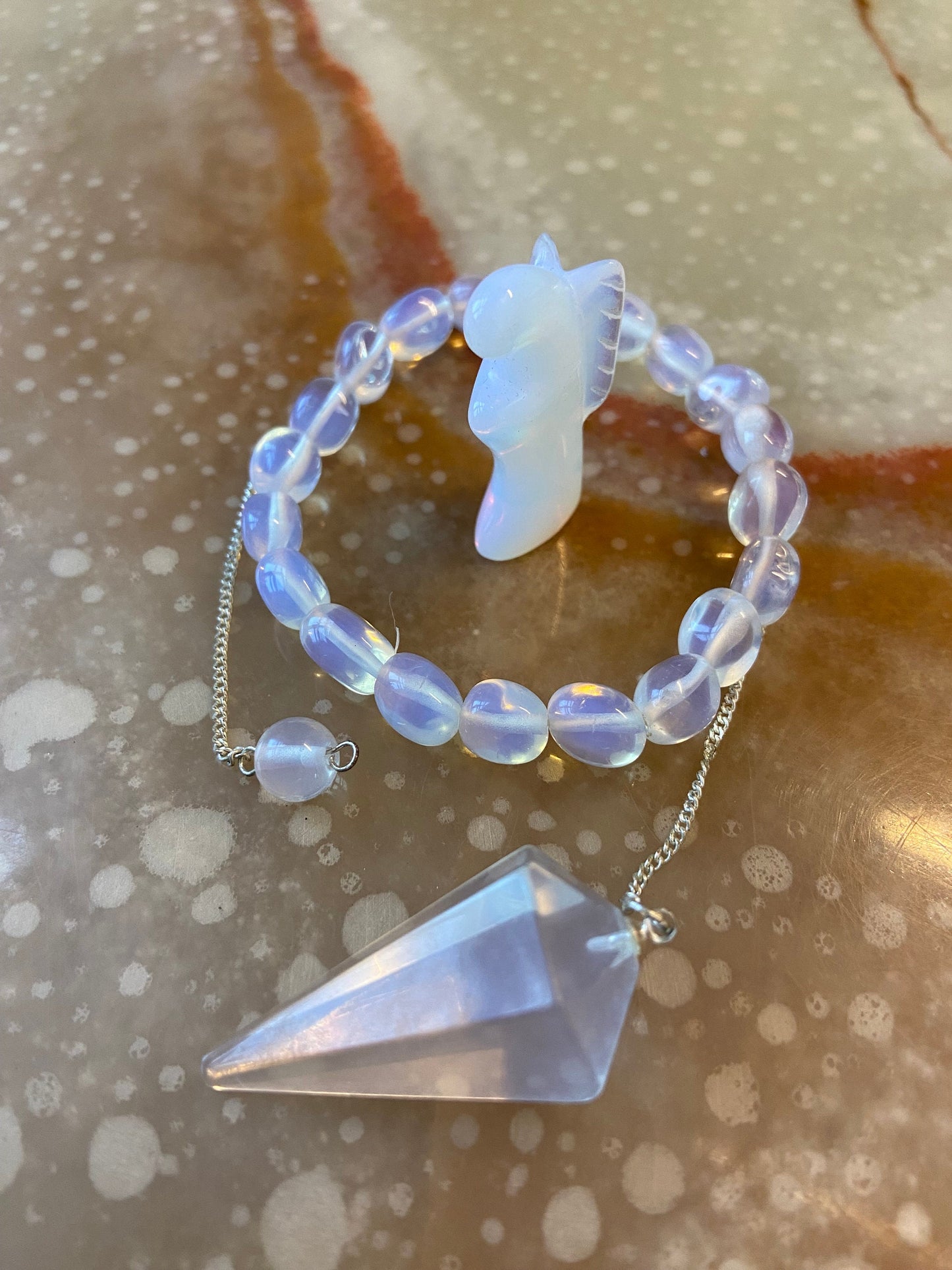 Embrace the serene energy of opalite with this divine set featuring a carved angel figurine, a harmonious bracelet, and a mystical dowsing pendulum. This collection is perfect for those seeking balance, clarity, and a touch of celestial guidance in their spiritual practices.