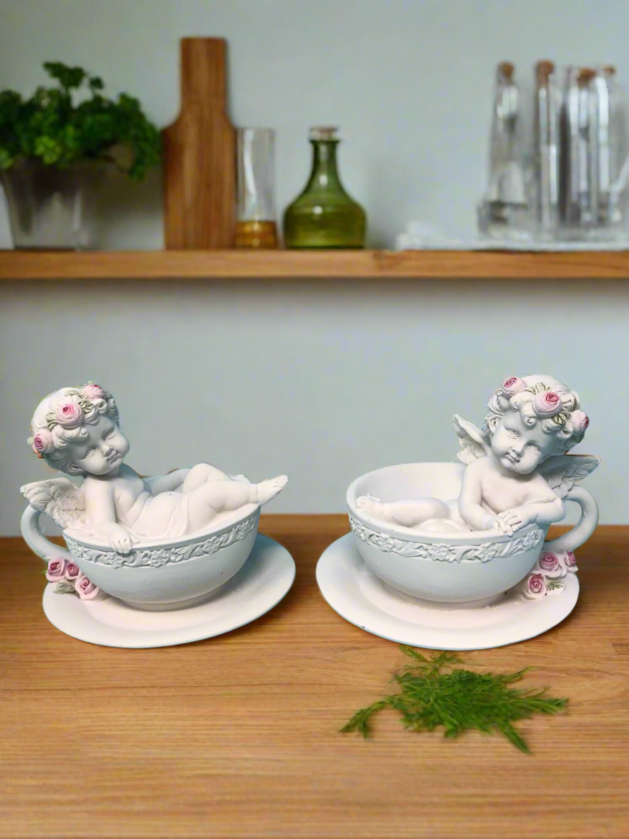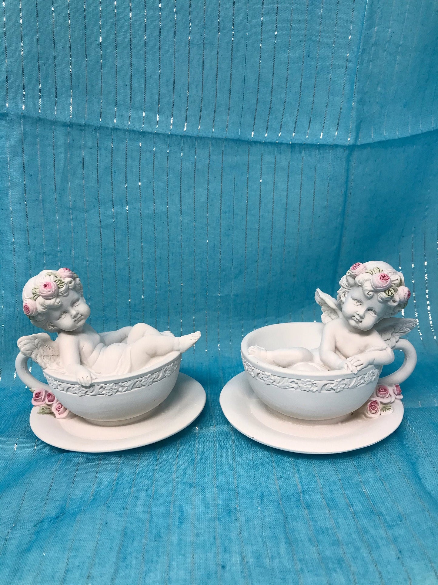 Pair of Guardian Angel Figurine Cherubs in Tea Cups Statue Ornament Sculpture