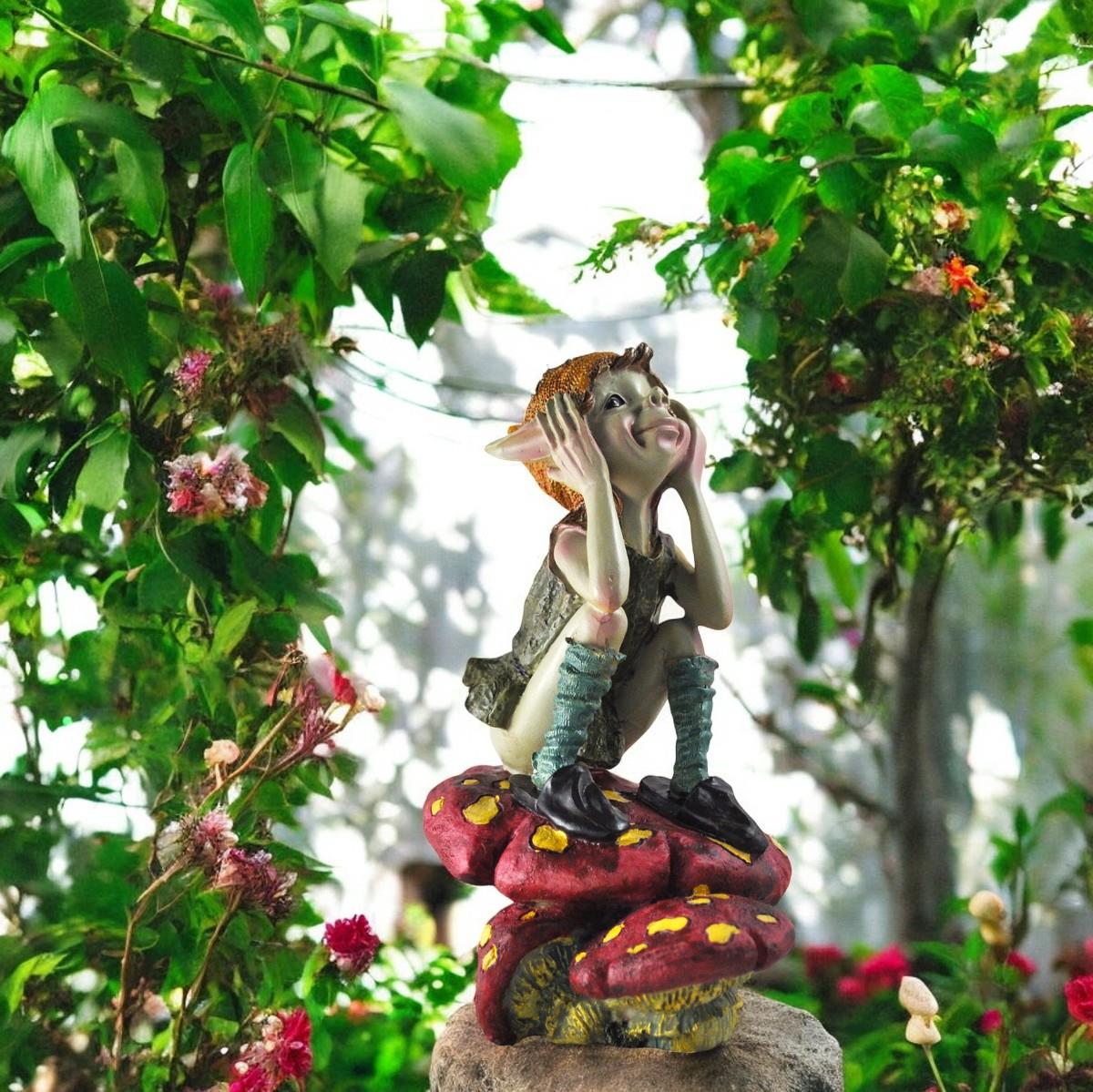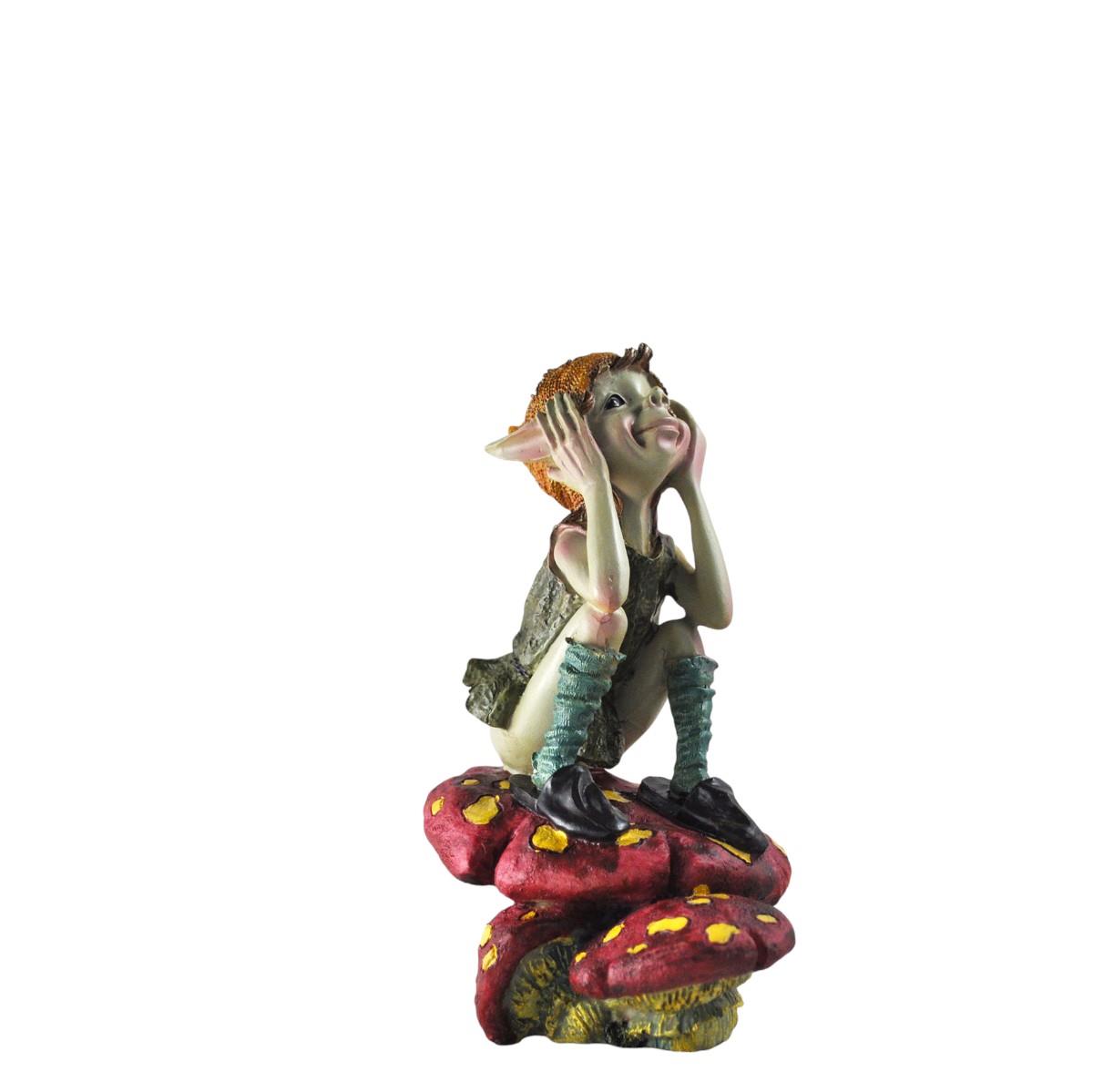 Pixie Thinking on Mushroom - Enchanting Green Garden Decor - Whimsical Elf Figurine - Fun Quirky Gift - 17.5cm Tall