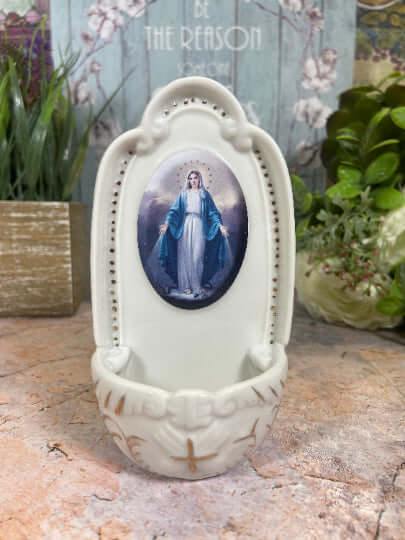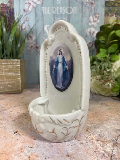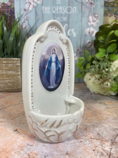 Porcelain Our Lady of the Miraculous Virgin Mary Water Font | Elegant Religious Decor | Holy Water Vessel | 13.5 cm