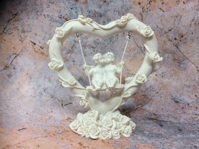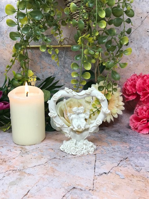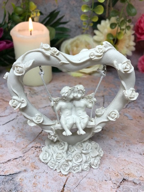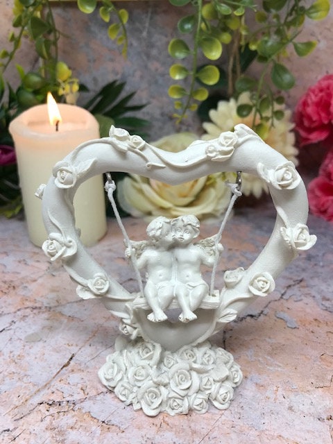 Celebrate the beauty and purity of these heavenly beings with our exquisite collection. Shop today and discover the perfect gift for yourself or a loved one. Add a touch of heaven to your home with our Pretty Pair of Angel Cherubs Sitting On Swing inside Rose Covered Heart Ornament.