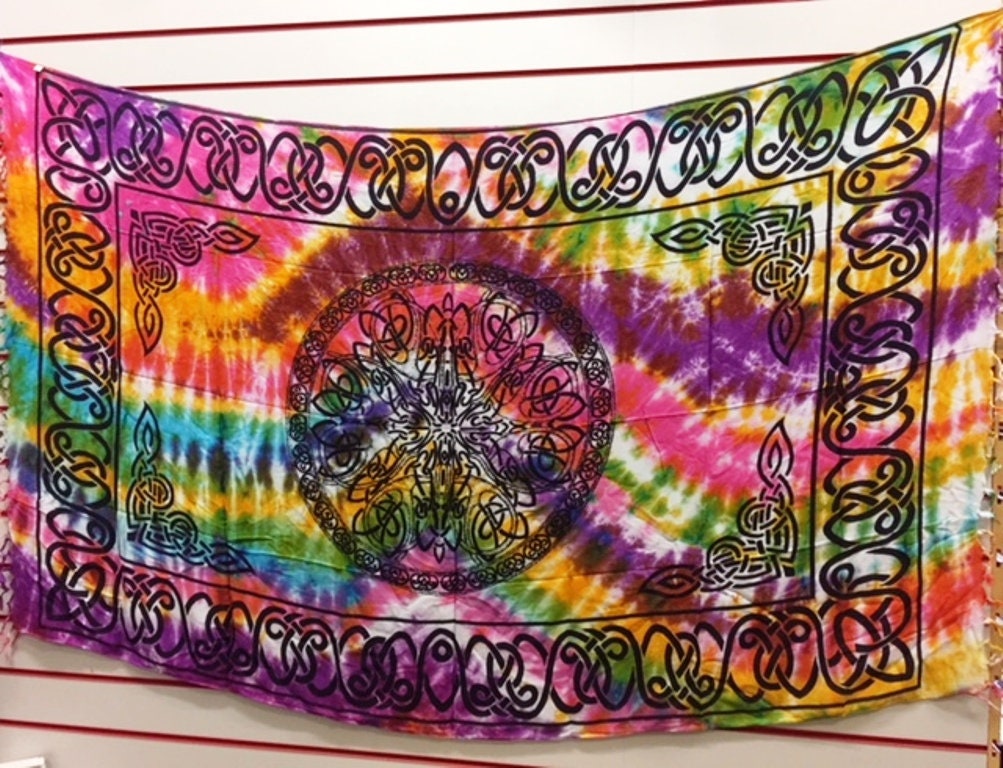 This tapestry features an intricate Celtic knot design at its heart, surrounded by a radiant burst of tie-dye patterns that symbolize unity and eternal spiritual life. The mesmerizing colour palette injects life into any space, making it ideal for use as a captivating wall hanging, an altar cloth imbued with symbolism, or as a statement piece in your home decor.