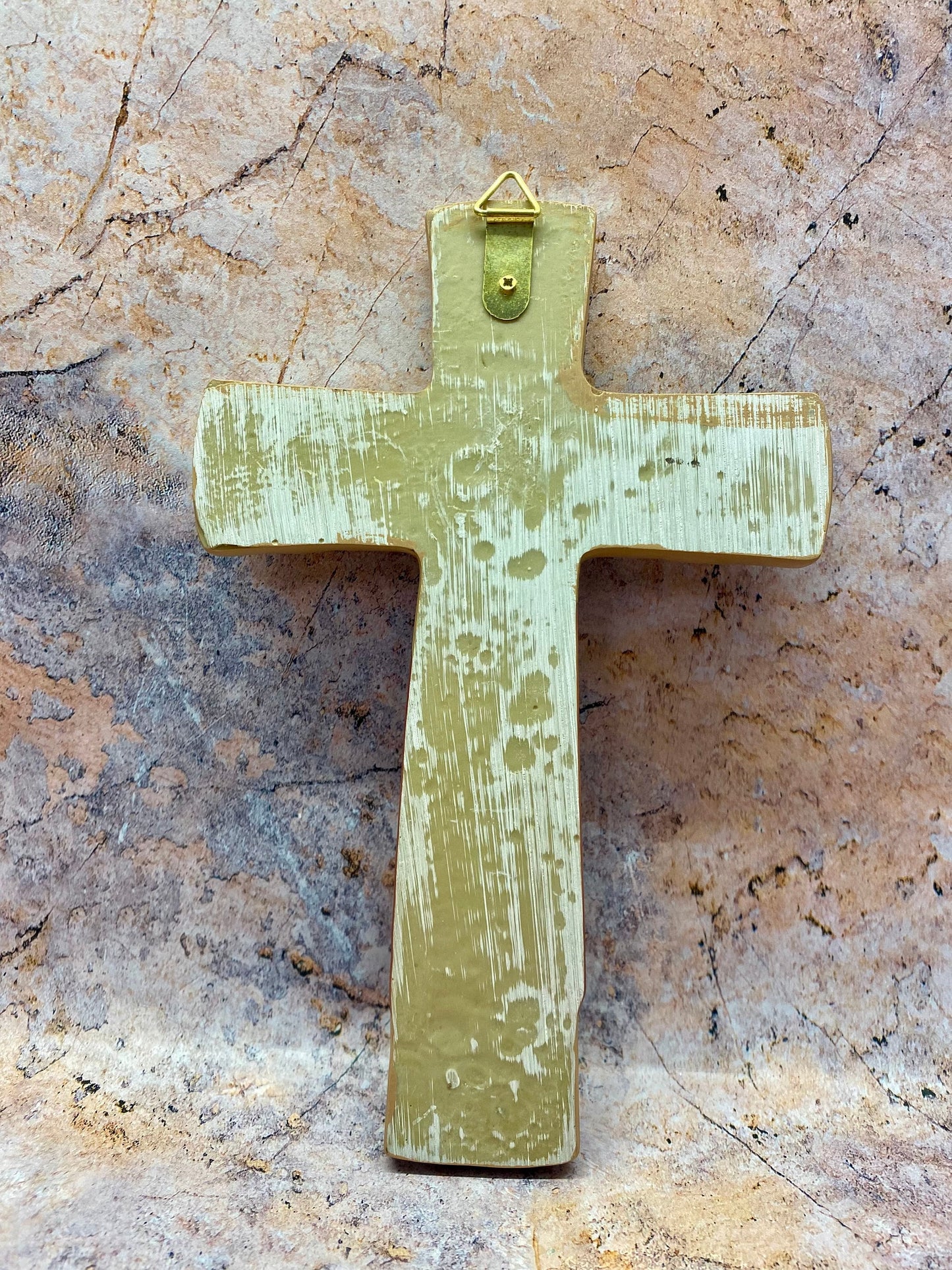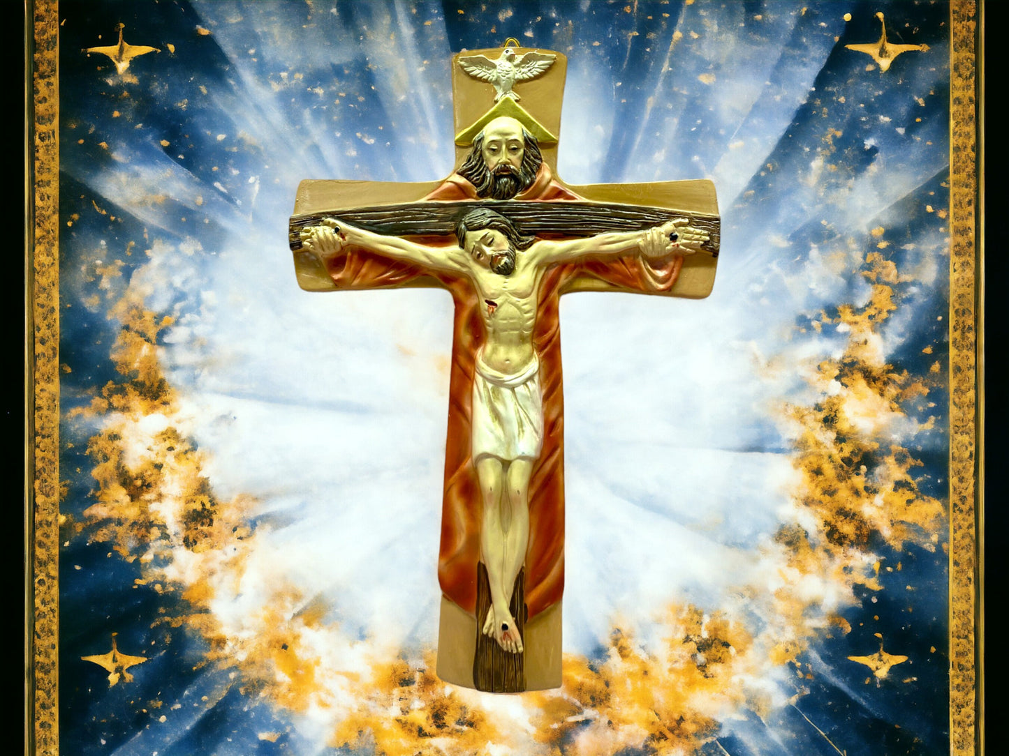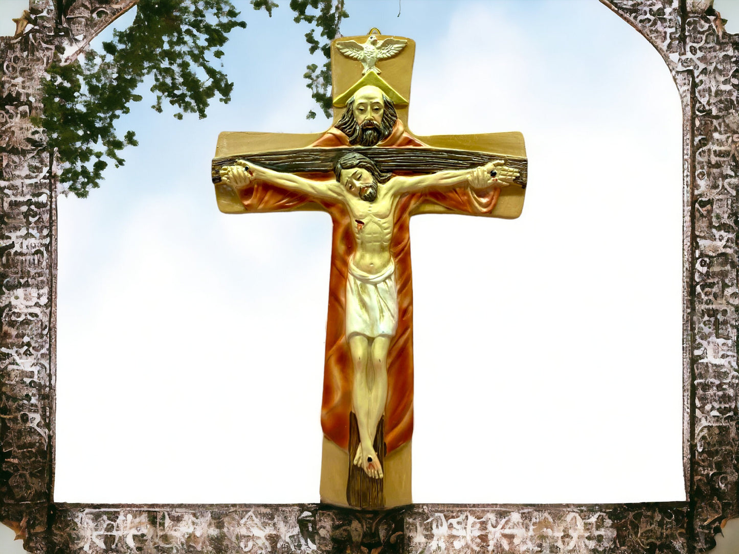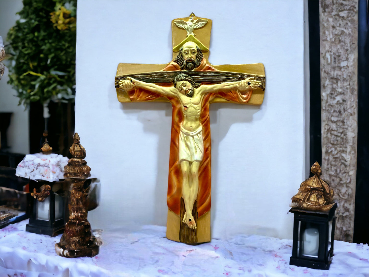 Designed to be easily hung, this sacred piece serves as a daily reminder of love, sacrifice, and hope. Whether you're continuing a devout family tradition or starting a new one, this Holy Trinity Wall Cross is a tangible touchstone to your faith that's both inspirational and visually stunning.