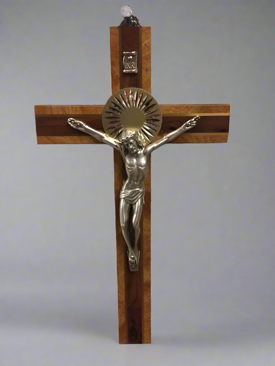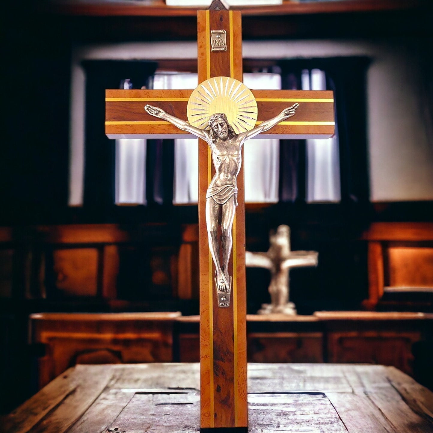Discover the solemn beauty of faith with this elegantly crafted 20 cm tall Wall Cross, featuring a detailed silver metal corpus on a sturdy wooden base. A symbol of sacrifice and love, this cross is designed to bring a sense of peace and serenity to any space.