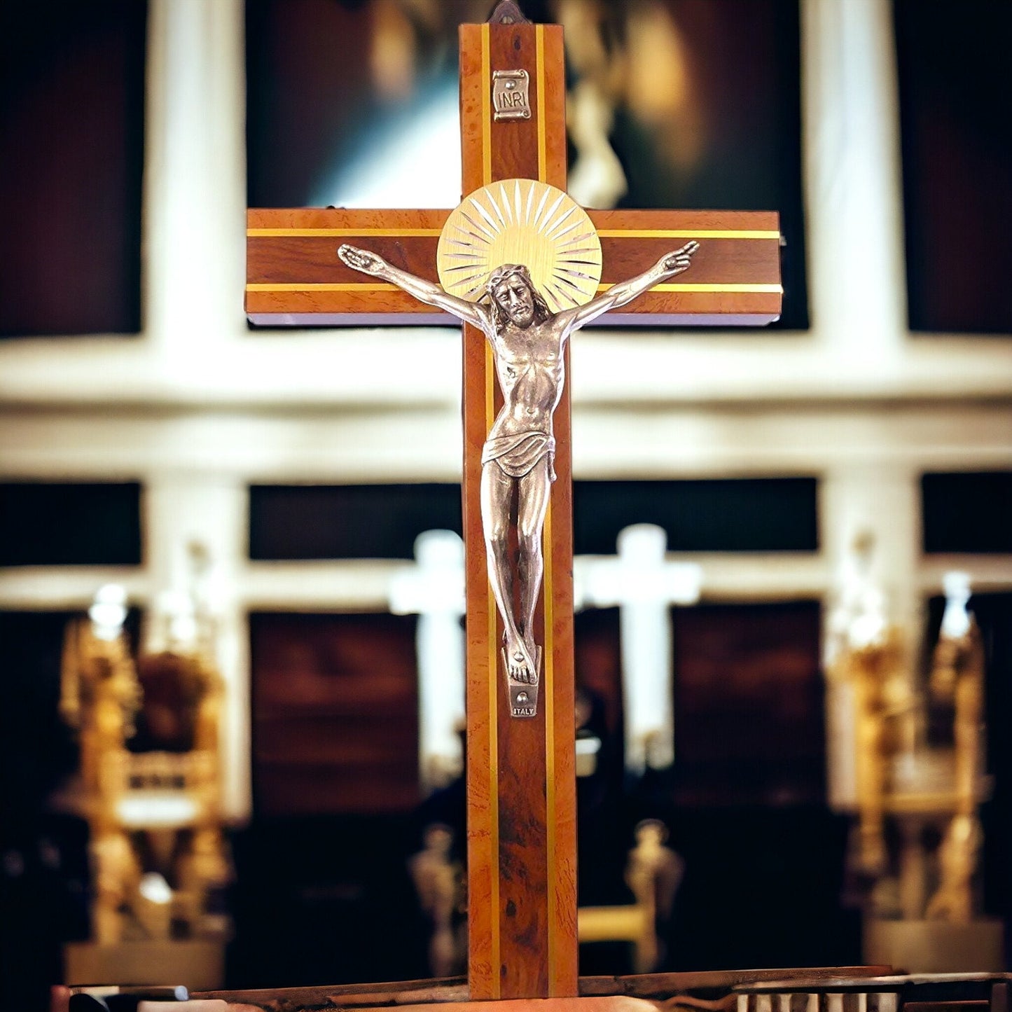 The silver corpus is intricately designed, capturing the essence of spiritual devotion. Mounted on polished wood, the contrast highlights the fine craftsmanship and attention to detail. This wall cross is not merely a decoration but a profound statement of faith that resonates within the heart.