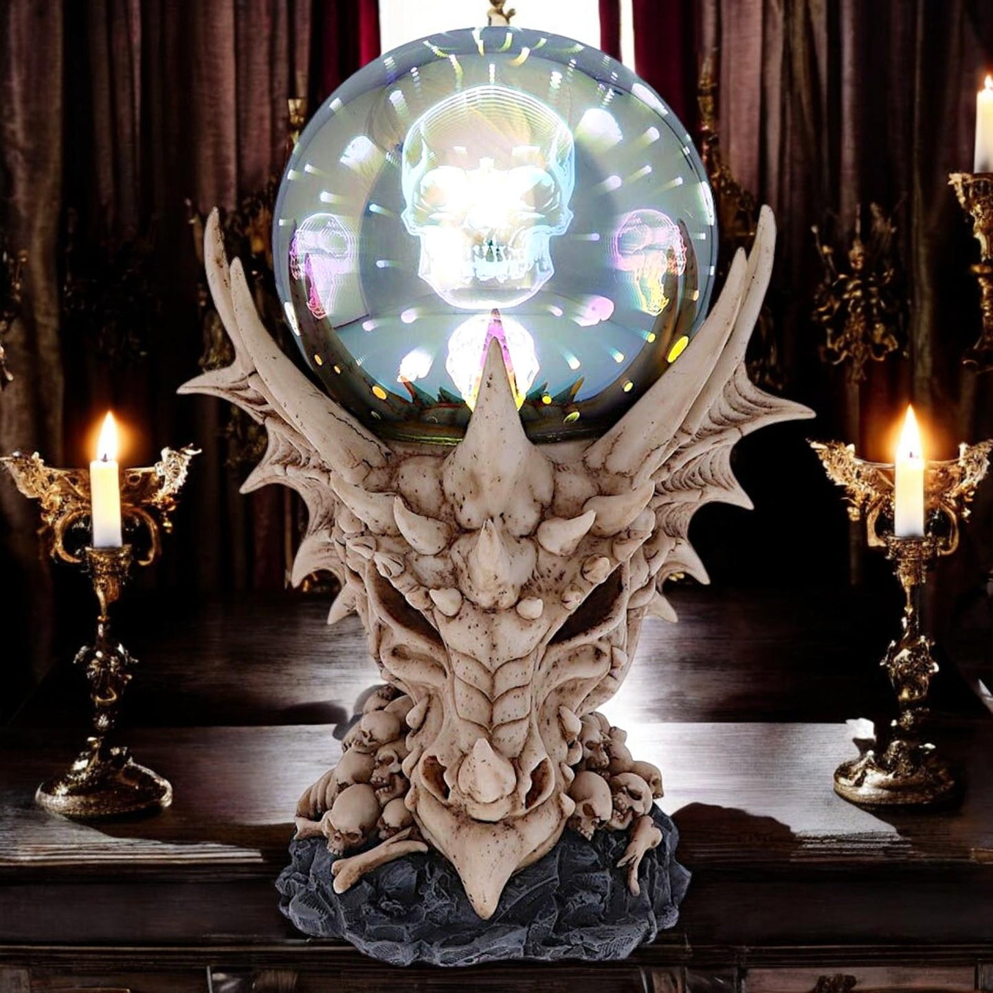 Unleash the allure of gothic fantasy with the Skeletal Realm Dragon Skull and Light-Up Orb Figurine. This intricately detailed piece serves as a majestic plinth for a mesmerizing silver orb. Once activated, the orb projects multi-coloured skulls, creating a captivating visual effect that will elevate any mystical or gothic-themed decor.