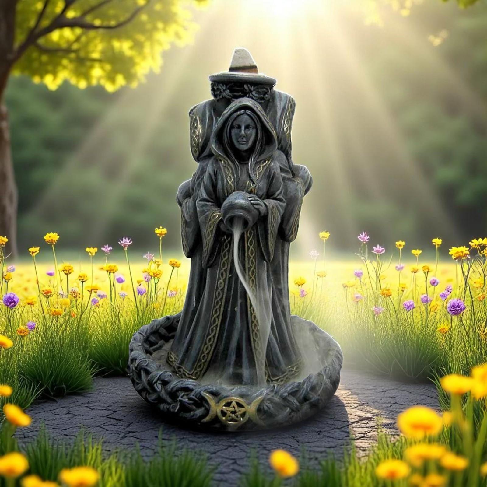 Expertly cast in the finest resin and hand-painted with intricate detail, this figure depicts the Maiden, Mother, and Crone, representing the three life stages of the Goddess. The central figure holds a vessel for the backflow incense cone, creating a mesmerising smoky waterfall effect that cascades around her robe and base.