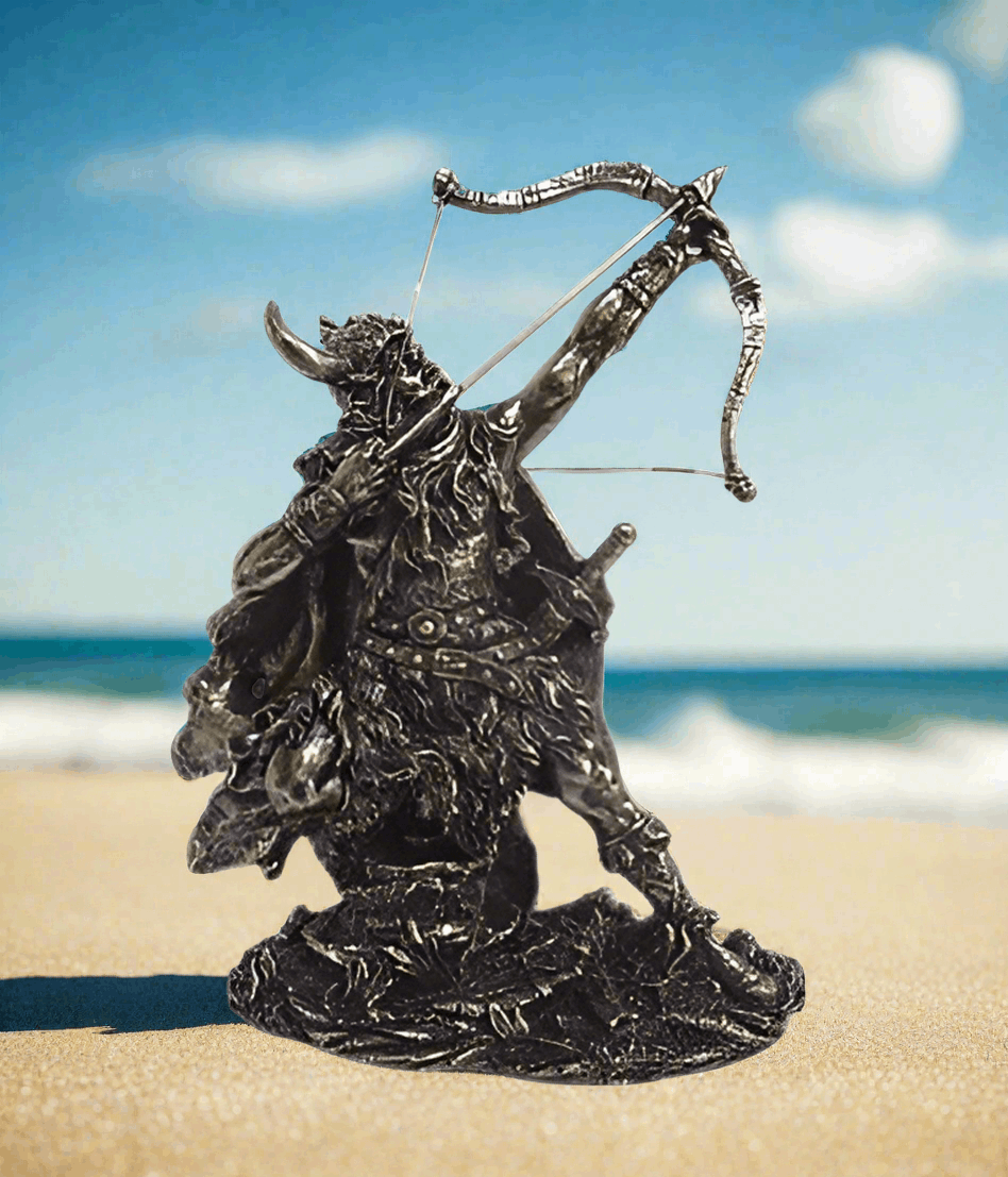 Celebrate the bravery of Norse warriors with this detailed Viking Archer Sculpture, sized 19.5 x 15 cm. This finely crafted statue is made from high-quality resin, portraying a Viking warrior in mid-action, pulling his bow and ready for battle. The intricate detailing in the armor, cloak, and weaponry brings the figure to life, making it a perfect addition to any collection of historical or mythological decor. This handcrafted piece is ideal for lovers of Viking history, Norse mythology, and warriors of old. It comes safely packaged in its own box, making it an excellent gift for collectors or enthusiasts.