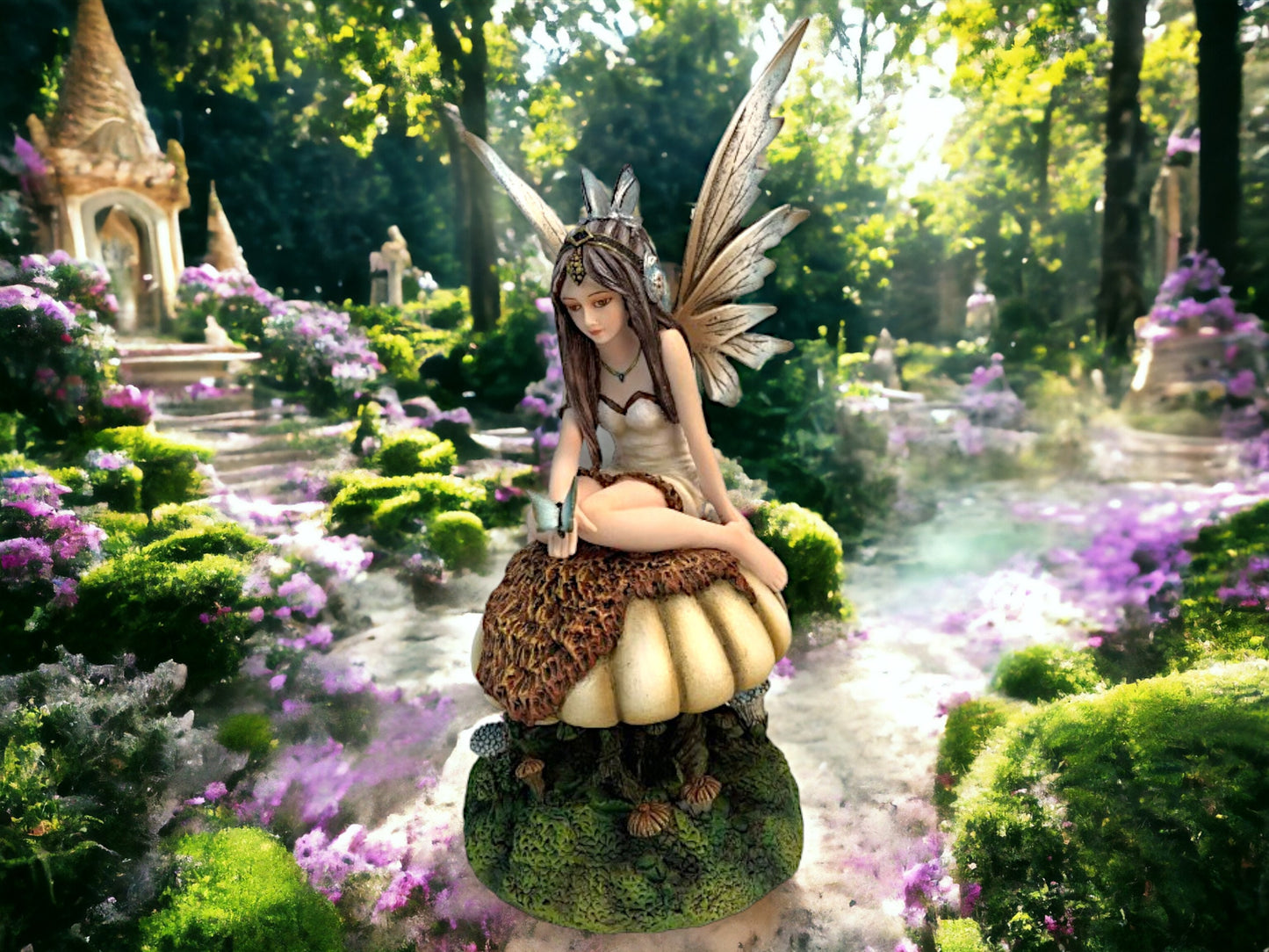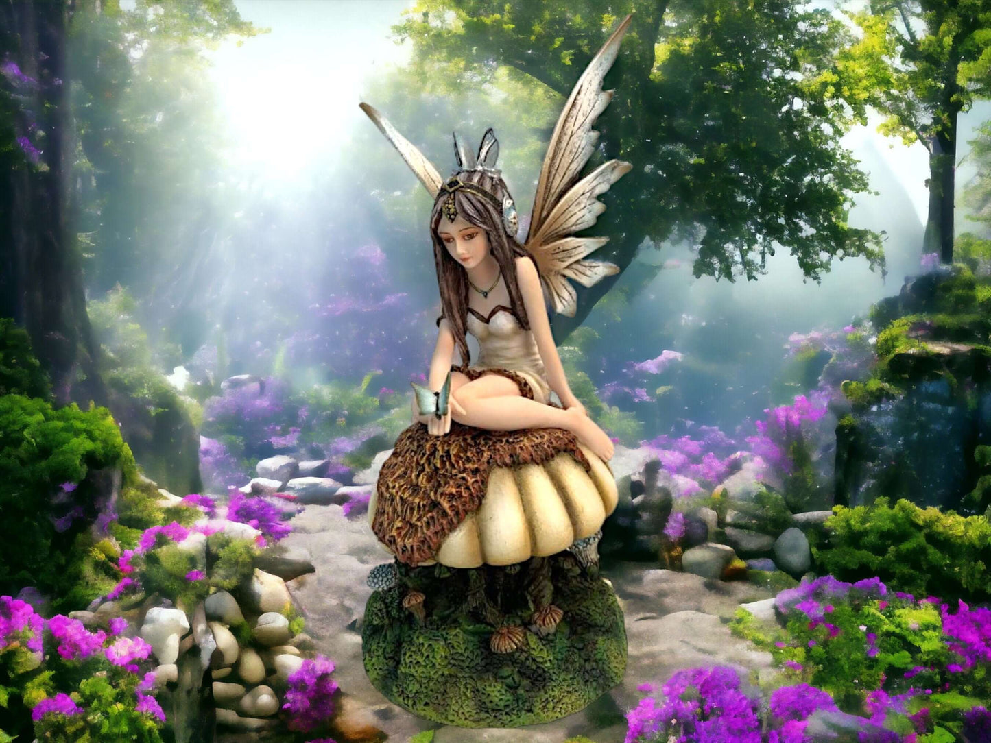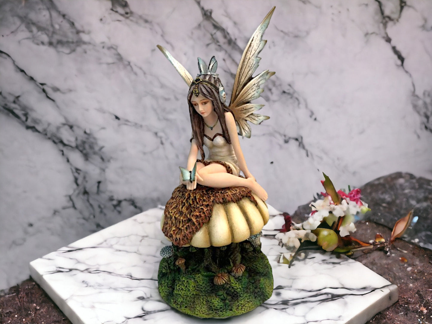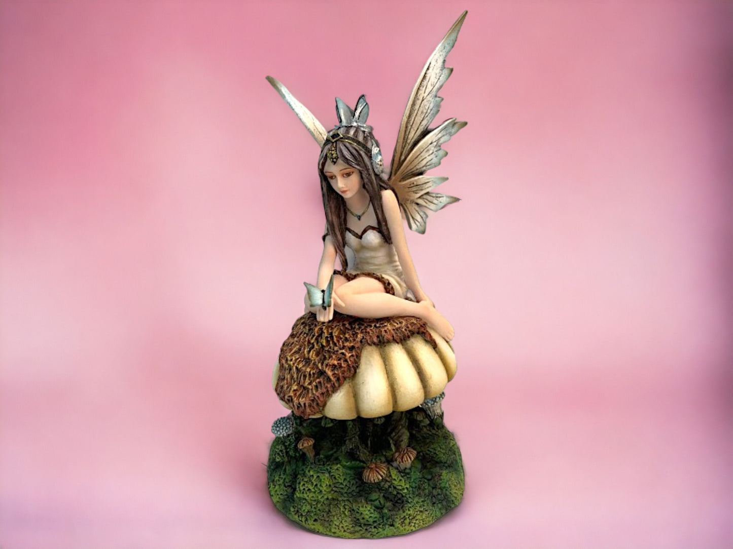 As she sits, lost in a moment with a tiny butterfly friend, this fairy brings a whisper of serenity and charm to any space. Her wings, kissed with the colors of twilight, suggest a life lived among the falling leaves and ancient trees. Every detail, from the gentle creases of the mushroom cap to the fairy's contemplative expression, is crafted to inspire and delight.